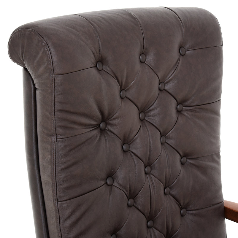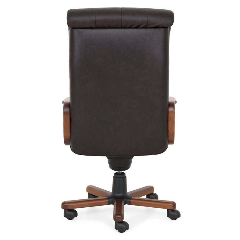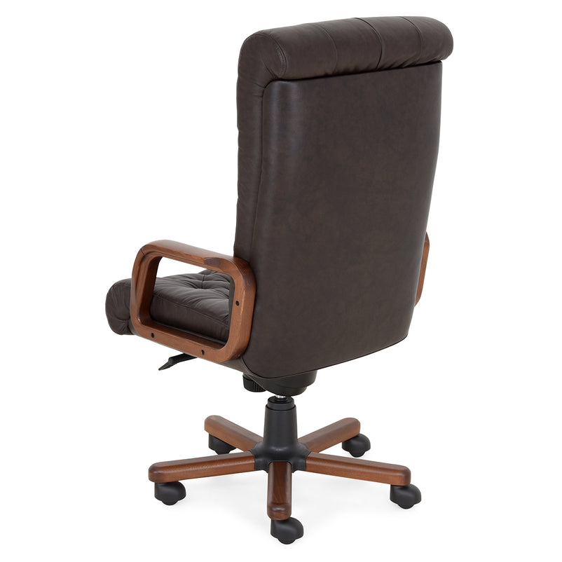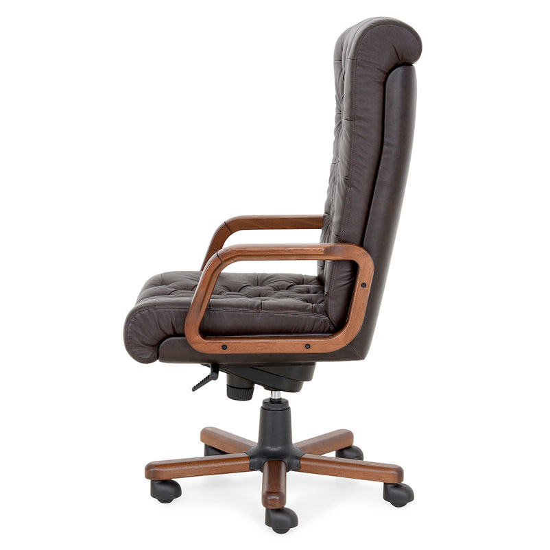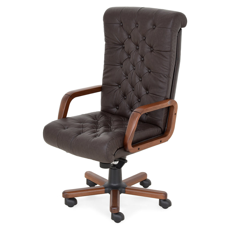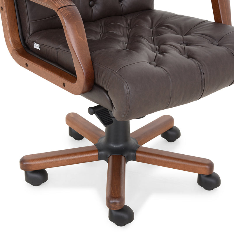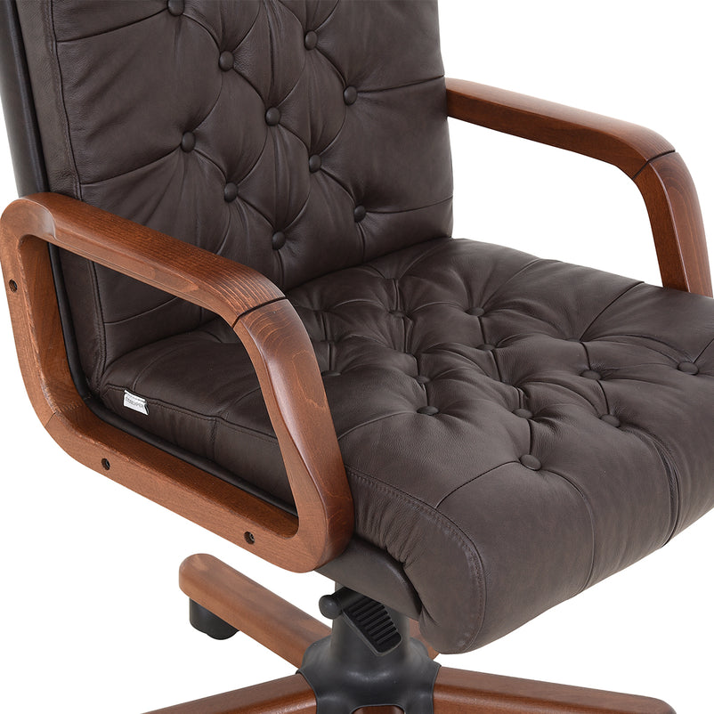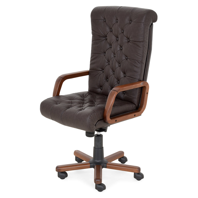 Scaun birou Cronos. Cu un design elegant și deosebit de confortabil, scaunul Cronos oferă calitate și durabilitate. Are baza mobilă, cu roți potrivite oricărui tip de suprafață, realizată din metal cu acoperitoare din lemn masiv. Pentru maximum de confort, scaunul are înălțimea reglabilă și un mecanism oscilant, care oferă posibilitatea reglării intensității. Șezutul și spătarul sunt realizate din spumă poliuretanica de mare densitate, tapițate în piele și decorate cu nasturi tapițați. Brațele din lemn masiv sunt fixe, iar cadrul are o culoare închisă. Combinație perfectă între stil și utilitate, scaunul managerial Cronos contribuie la amenajarea unei zone de lucru practice și deosebite.