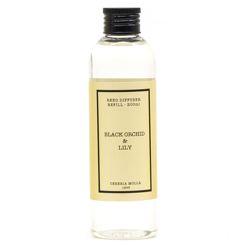 Rezervă parfum cameră Cereria Molla. Aroma: Black Orchid & Lily ne transportă la începutul primăverii. Aroma sa de flori proaspăt tăiate învăluie orice mediu cu lumină și bucurie.
