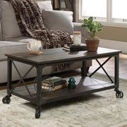 Măsuță cafea Steel River. Aspectul inedit și funcționalitatea recomandă măsuța Steel River drept piesa perfectă pentru spațiul vostru. Este realizată din panouri aglomerate din lemn și metal și are o cromatică inspirată din natură. Are rafturi deschise pentru depozitare, iar două din cele patru roți sunt prevăzute cu sistem de blocare. Măsuța Steel River va aduce spațiului un aer industrial.