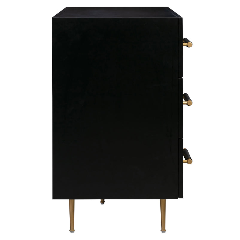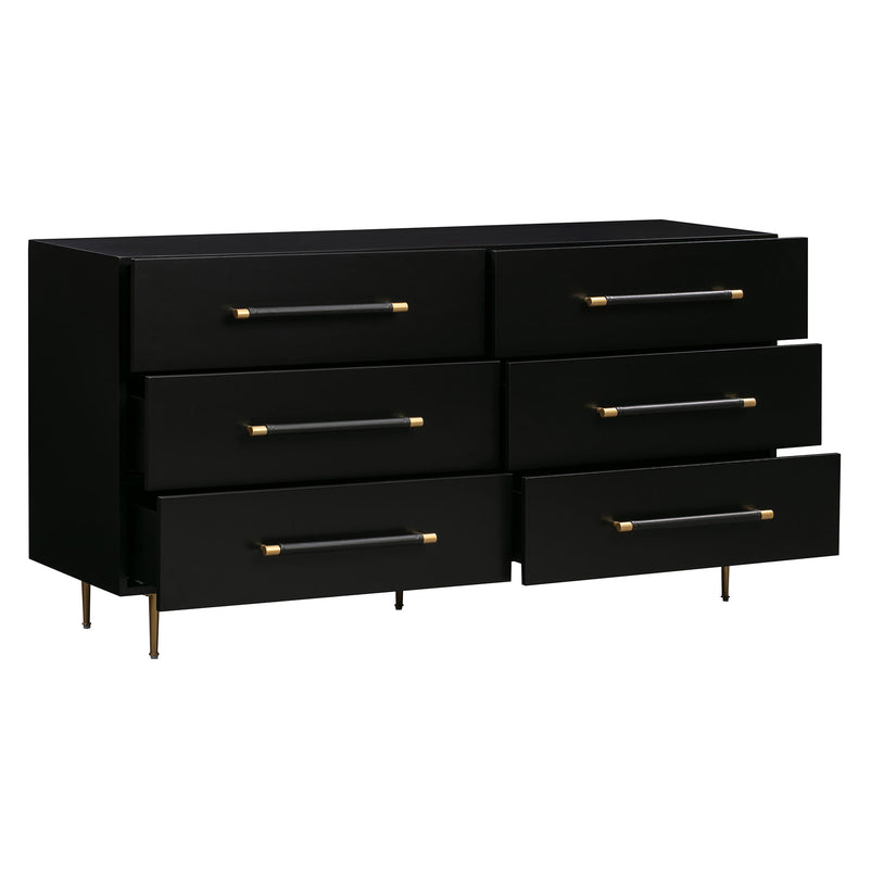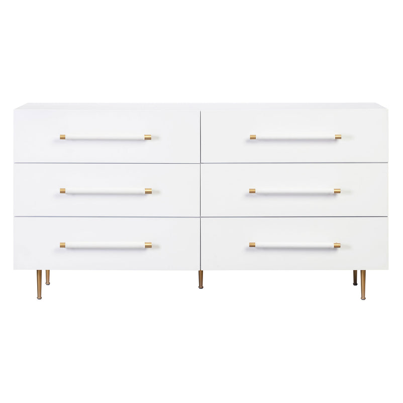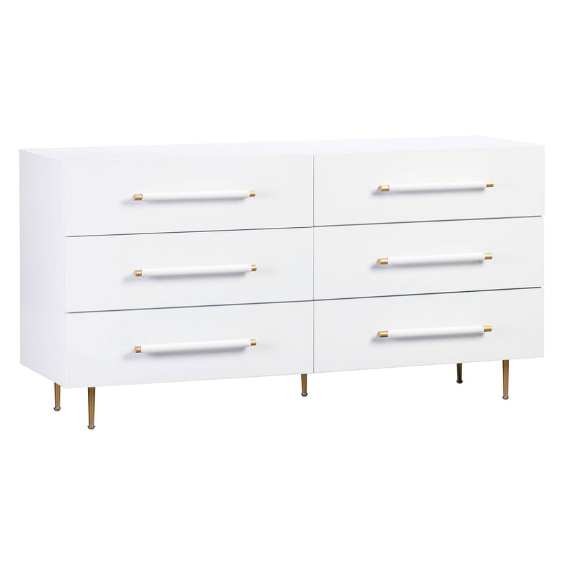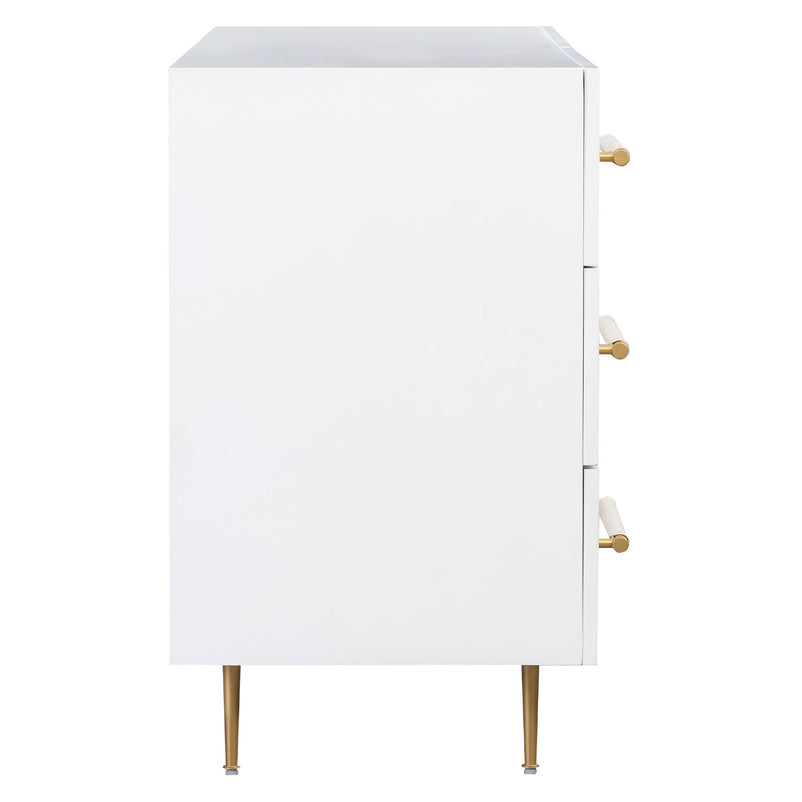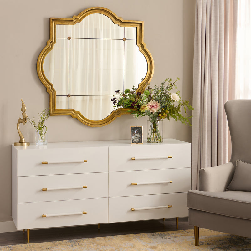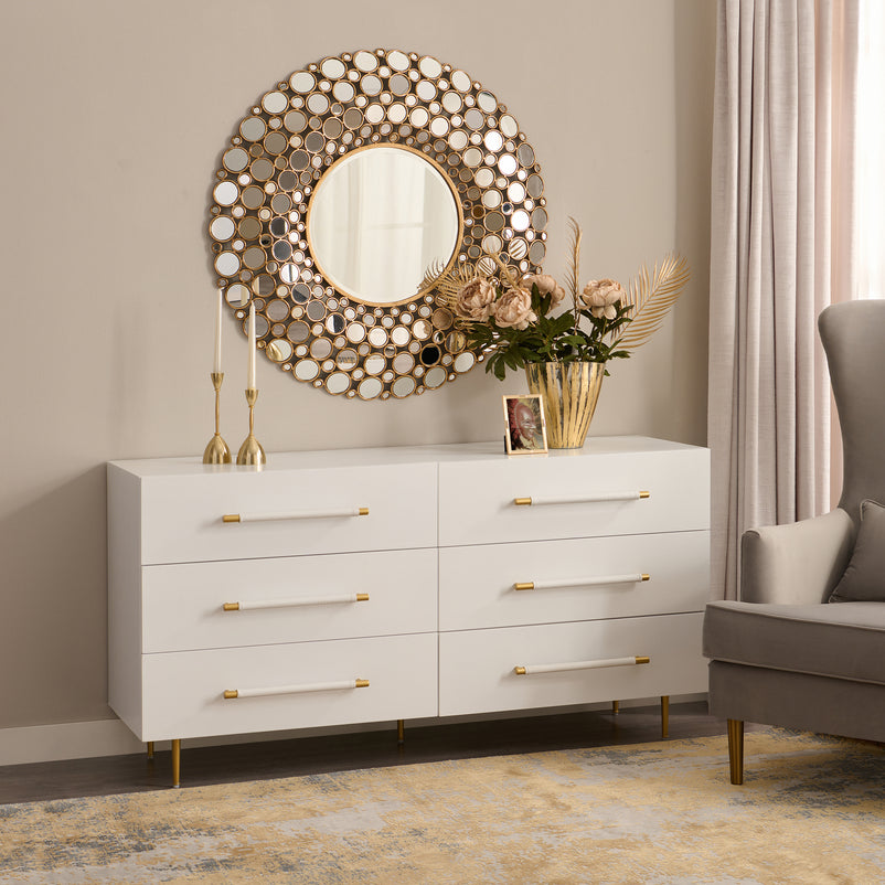 Comodă 6 sertare Maddison. Comoda Maddison este o piesă accent, care contribuie la amenajarea unui spațiu funcțional și estetic. Aceasta are un design modern și elegant, fiind ideală pentru camerele amenajate contemporan. Aceasta este prevăzută cu 6 sertare generoase glisante, cu mânere albe și extremități aurii pentru un plus de eleganță.