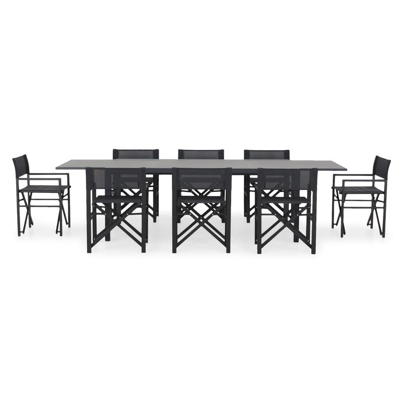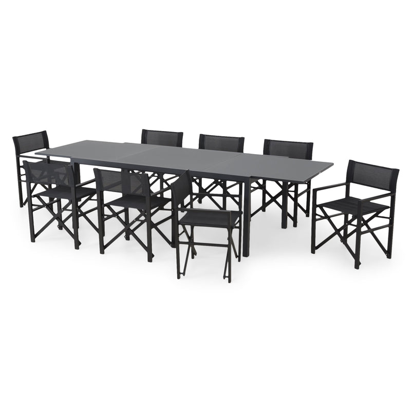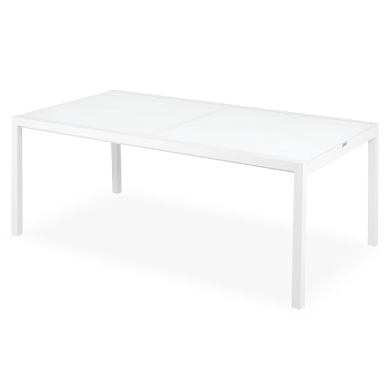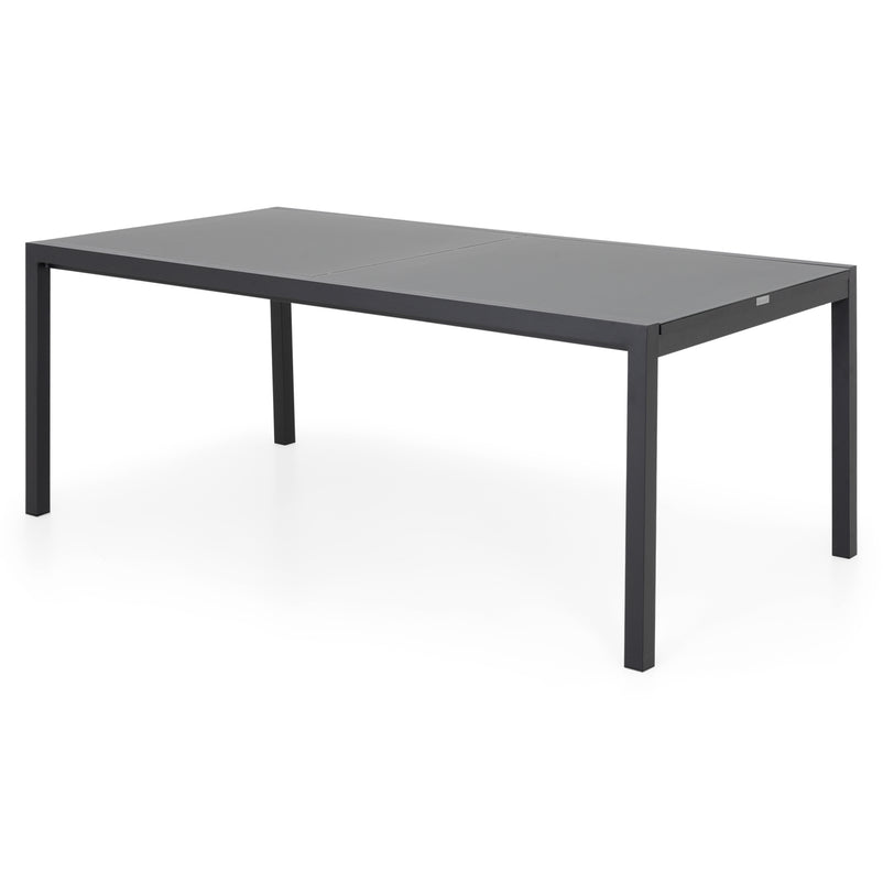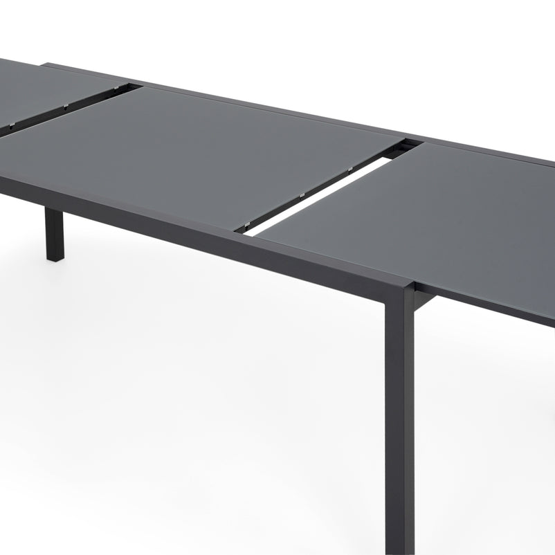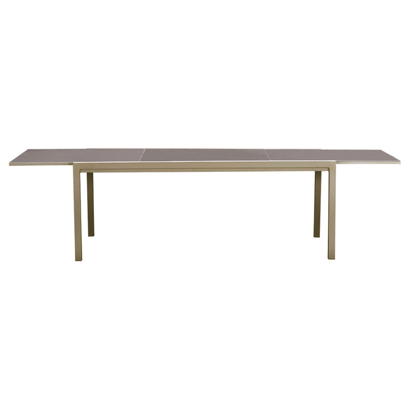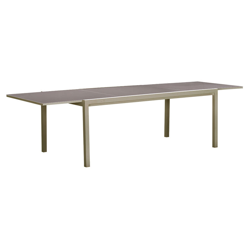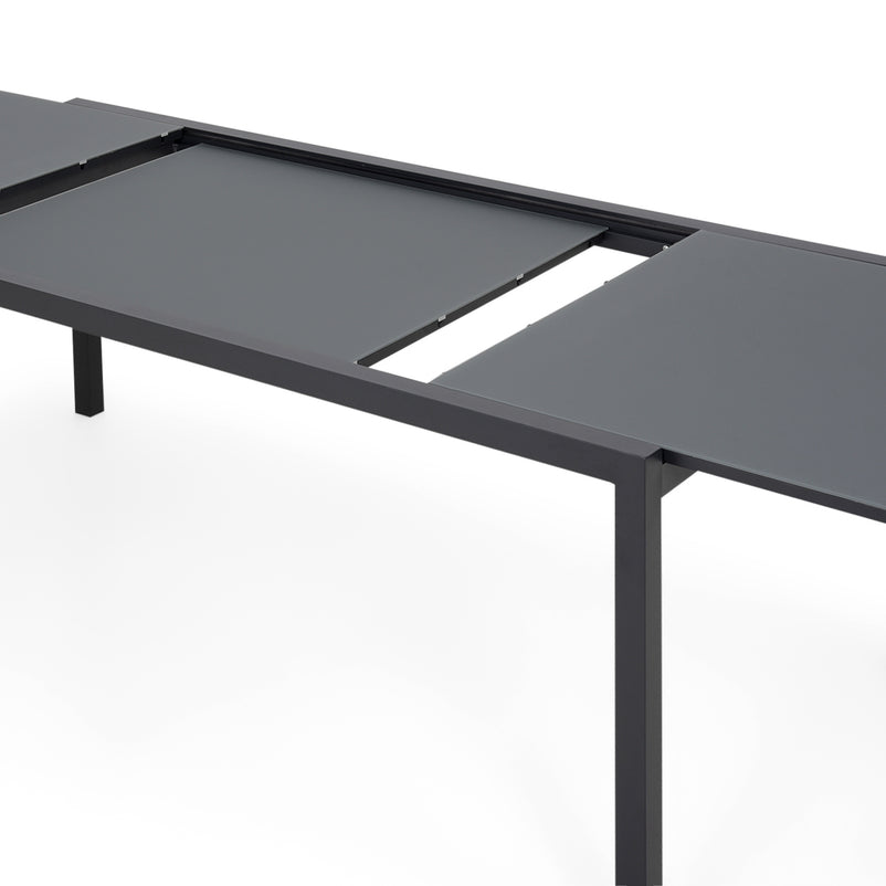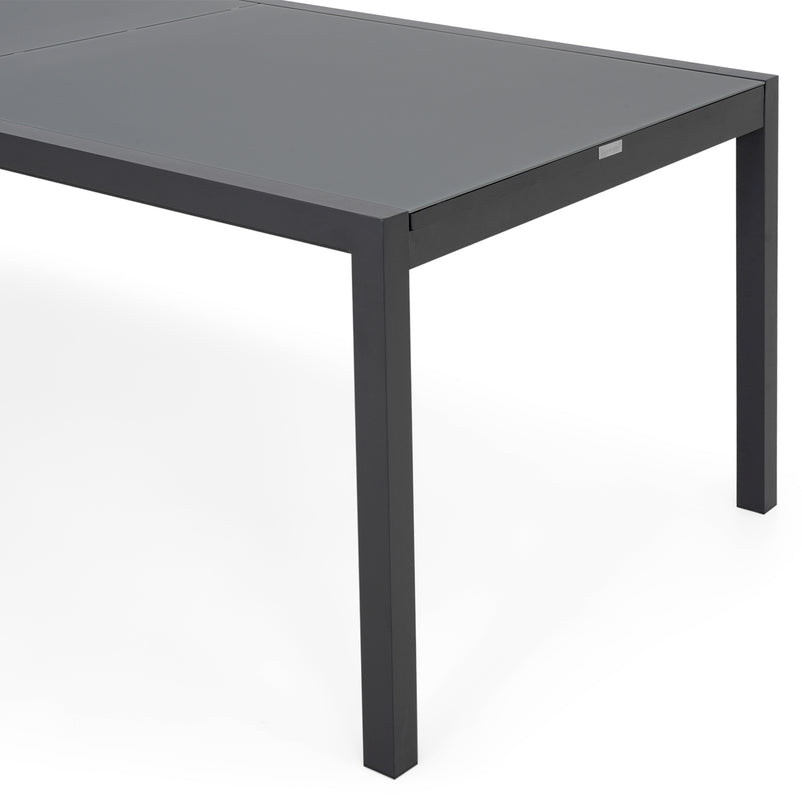 Masă extensibilă exterior Cosmo. Practică și cu design versatil, masa din gama Cosmo este ideală pentru a fi integrată pe terasa sau în grădina voastră. Masa este realizată din aluminiu vopsit în câmp electrostatic și are un top din sticlă securizată, care se poate extinde atunci când este necesar. Cromatica în nuanțe neutre integrează cu ușurință masa în decoruri dintre cele mai diverse.