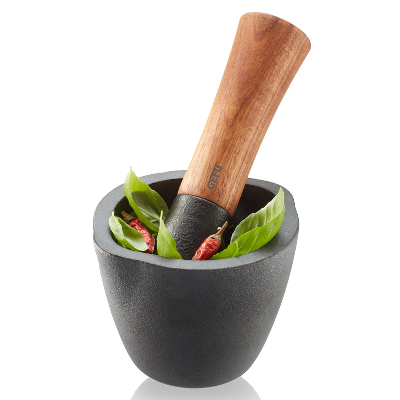 Mojar și pistil X-plosion. Măcinător mic și elegant, realizat din fontă masivă, cu un pistil din fontă și mâner din lemn de acacia. Dimensiunea ideală pentru cantități mici de ierburi și condimente, dar și pentru utilizarea la masă. Dispune de un orificiu pentru turnarea precisă a condimentelor. Este compatibil cu suportul pentru moară X-PLOSION®, M.