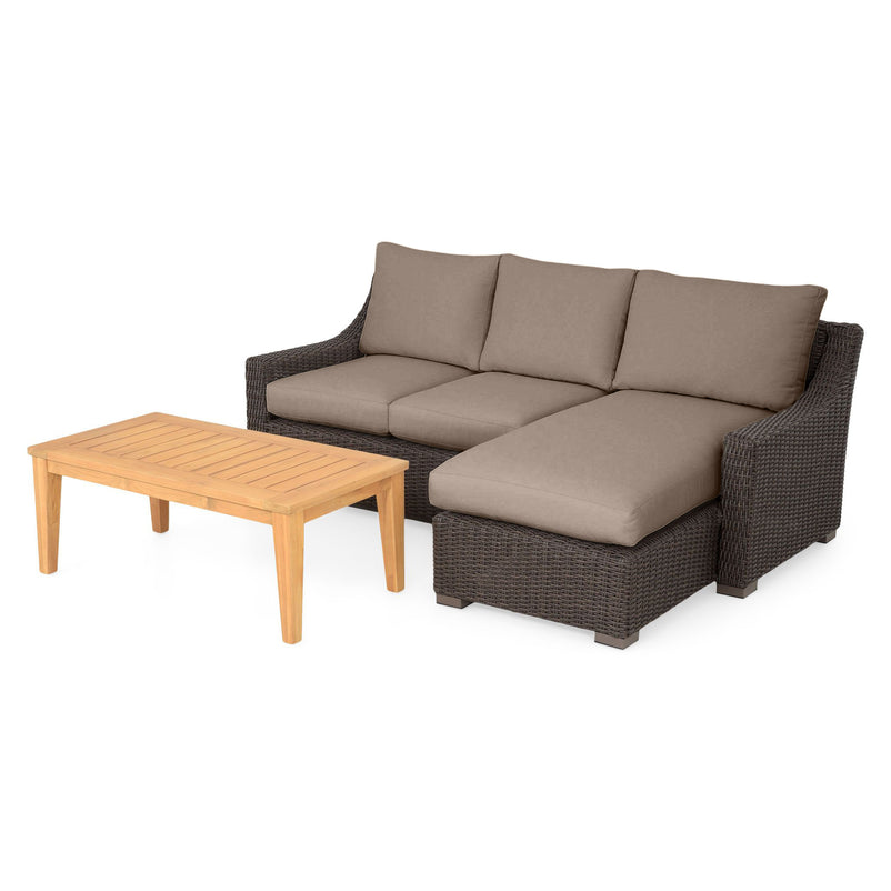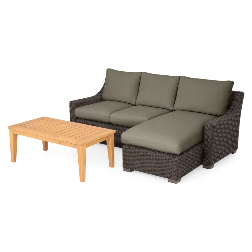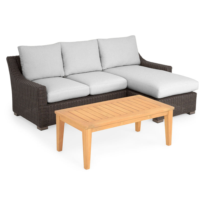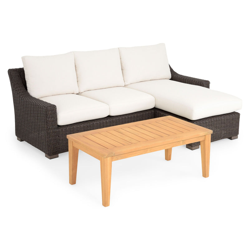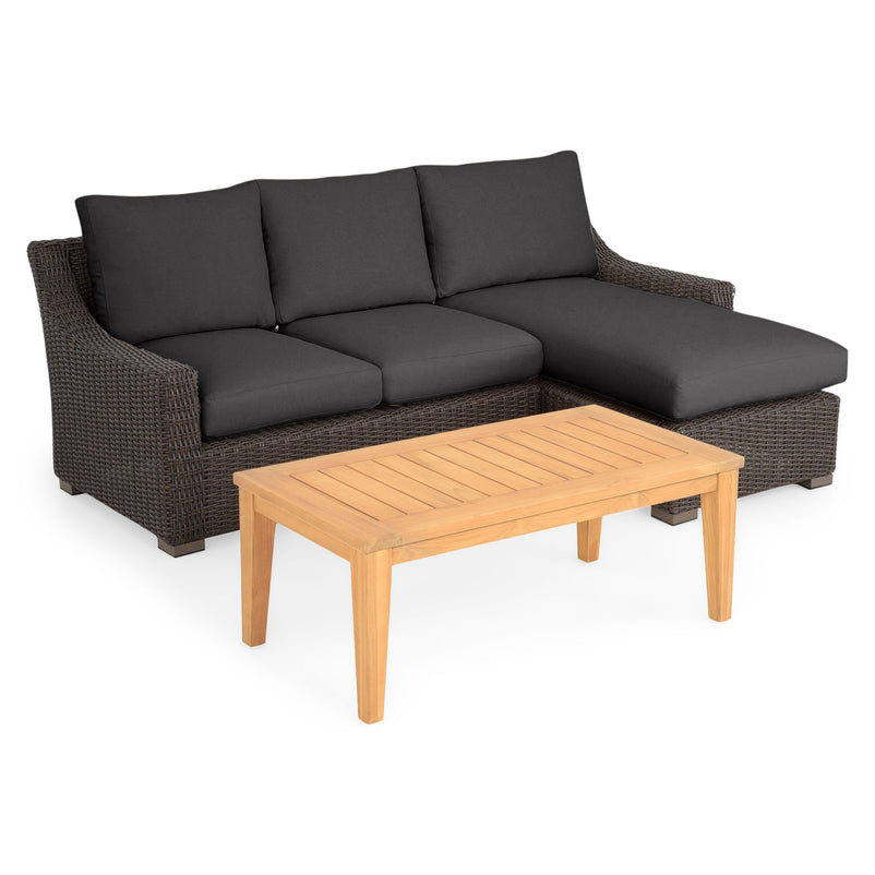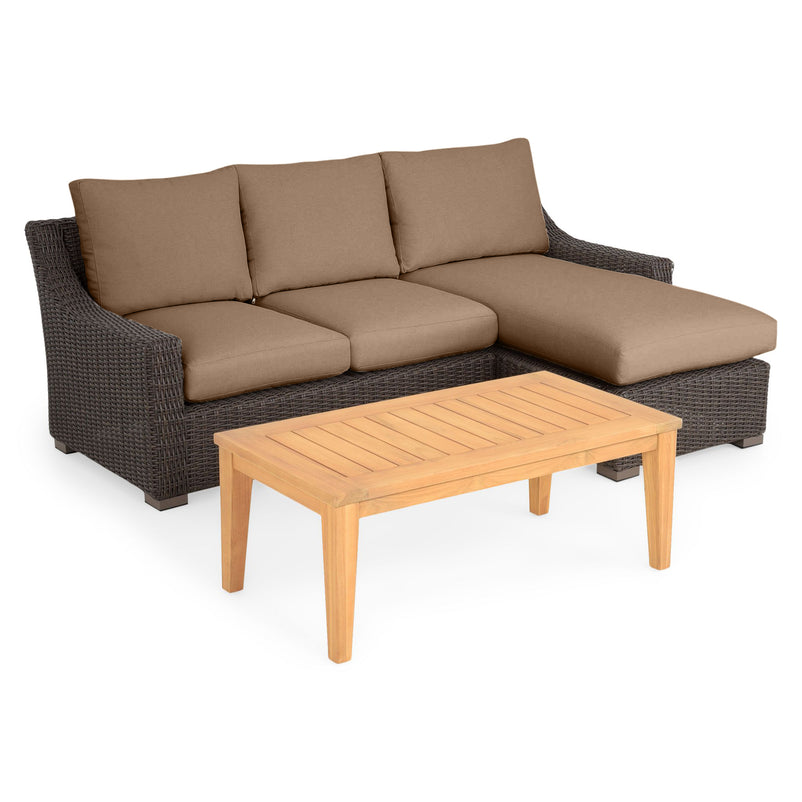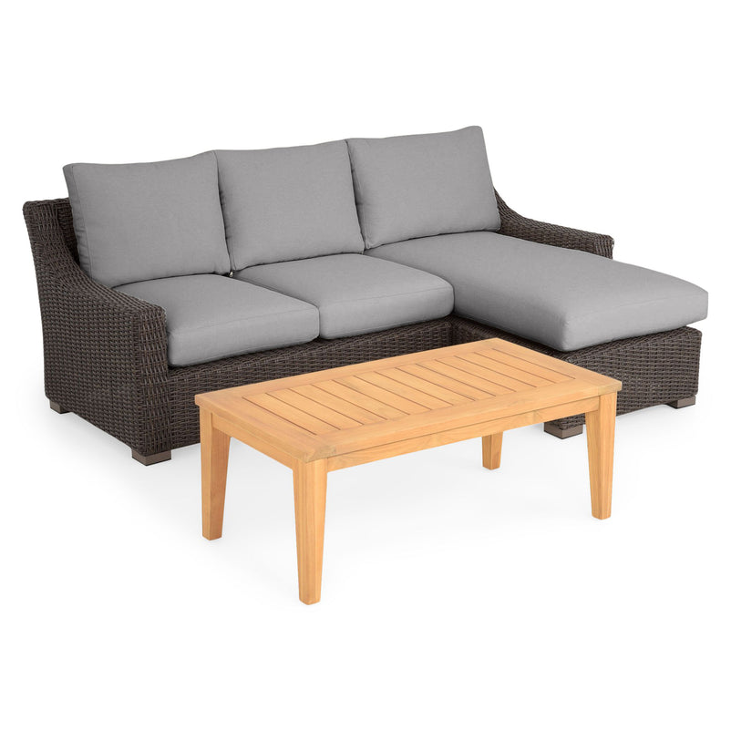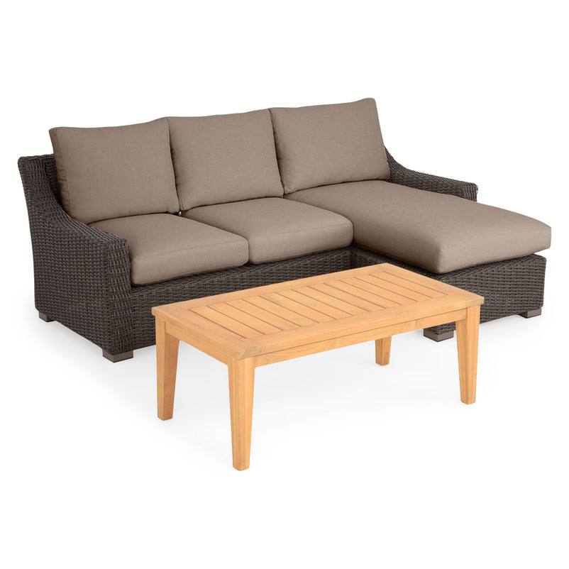 Set mobilier terasă/grădină, canapea, șezlong și măsuță Mesa. Terasa sau grădina voastră este principalul spațiu de relaxare în întreg sezonul călduros, iar cafeaua fierbinte savurată iarna în aer liber este un răsfăț. Vă puteți bucura de ambele mulțumită setului pentru terasă și grădină din gama Mesa, cu structura solidă și împletită cu fibre sintetice tratate UV, menite să o protejeze de intemperii. Pernele înalte vă garantează confortul, iar țesătura Olefin care le îmbracă le protejează împotriva umezelii și decolorării, astfel că vouă nu vă mai rămâne decât să vă bucurați de momentele de destindere. Măsuța este realizată din lemn de teak, iar dimensionarea echivalentă cu lungimea canapelei o face ideală pentru amenajarea armonioasă a setului.