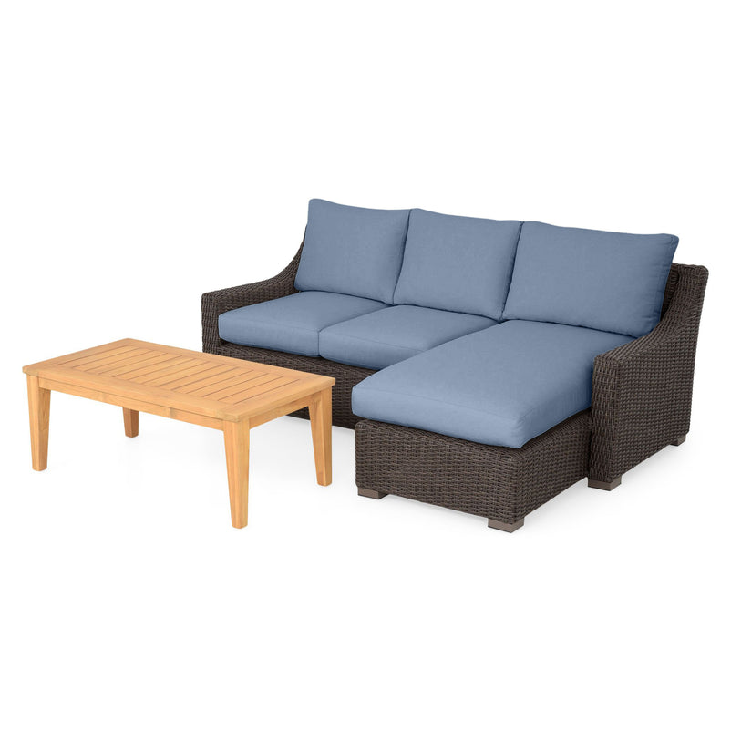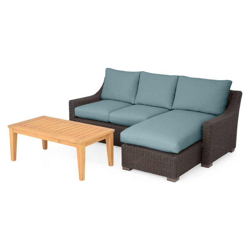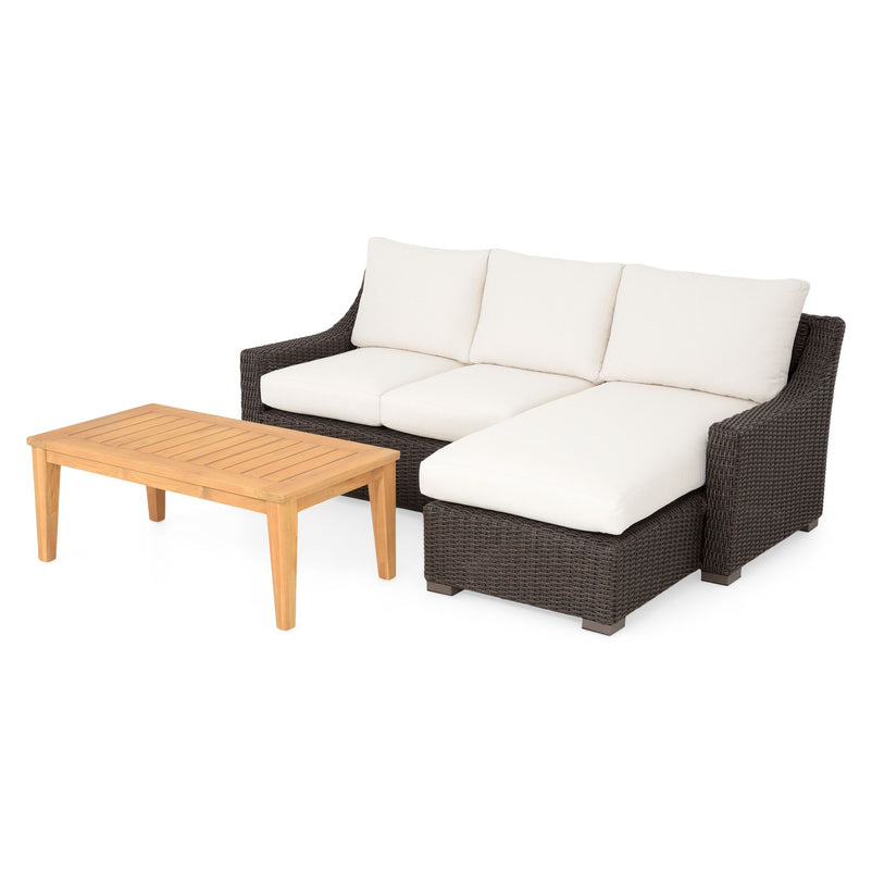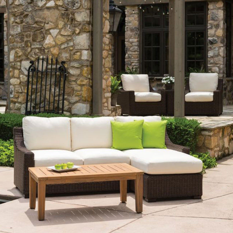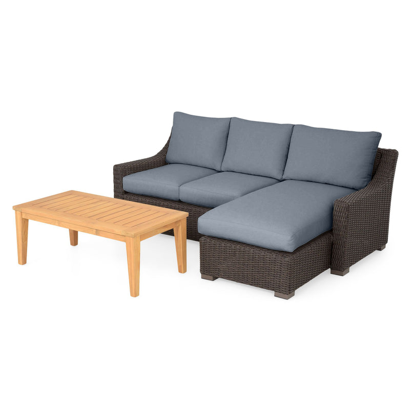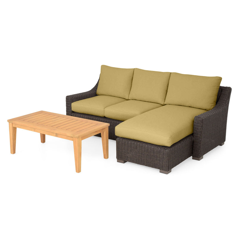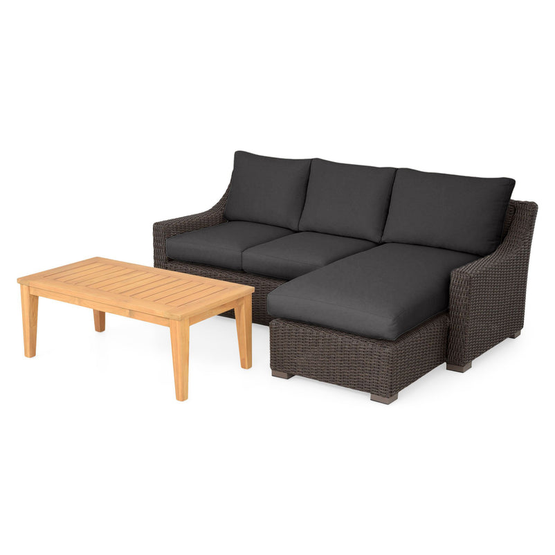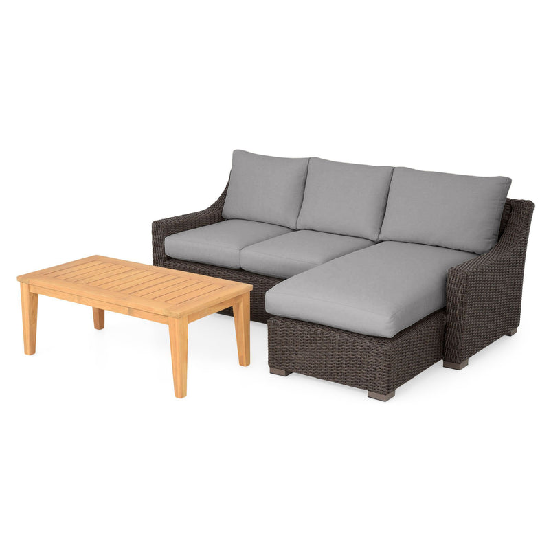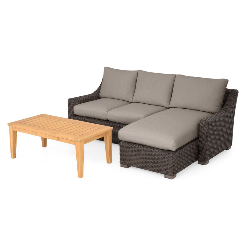 Set mobilier terasă/grădină, canapea, șezlong și măsuță Mesa. Terasa sau grădina voastră este principalul spațiu de relaxare în întreg sezonul călduros, iar cafeaua fierbinte savurată iarna în aer liber este un răsfăț. Vă puteți bucura de ambele mulțumită setului pentru terasă și grădină din gama Mesa, cu structura solidă și împletită cu fibre sintetice tratate UV, menite să o protejeze de intemperii. Pernele înalte vă garantează confortul, iar țesătura Olefin care le îmbracă le protejează împotriva umezelii și decolorării, astfel că vouă nu vă mai rămâne decât să vă bucurați de momentele de destindere. Măsuța este realizată din lemn de teak, iar dimensionarea echivalentă cu lungimea canapelei o face ideală pentru amenajarea armonioasă a setului.