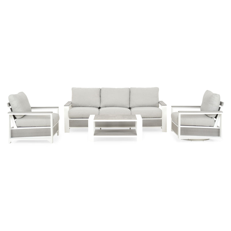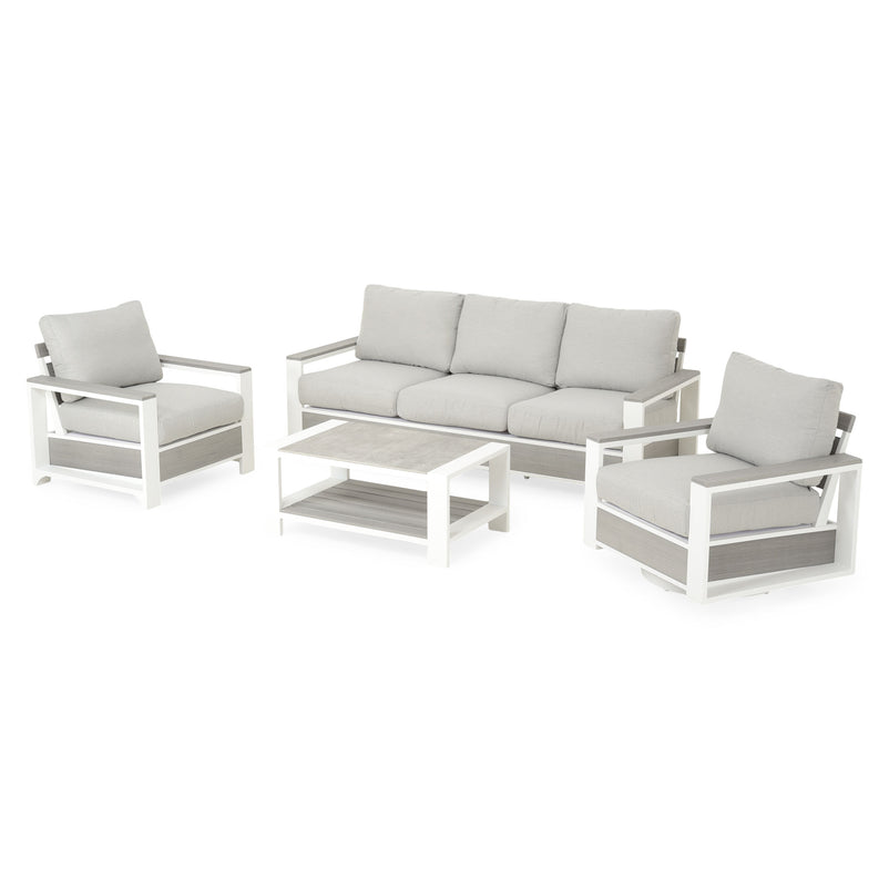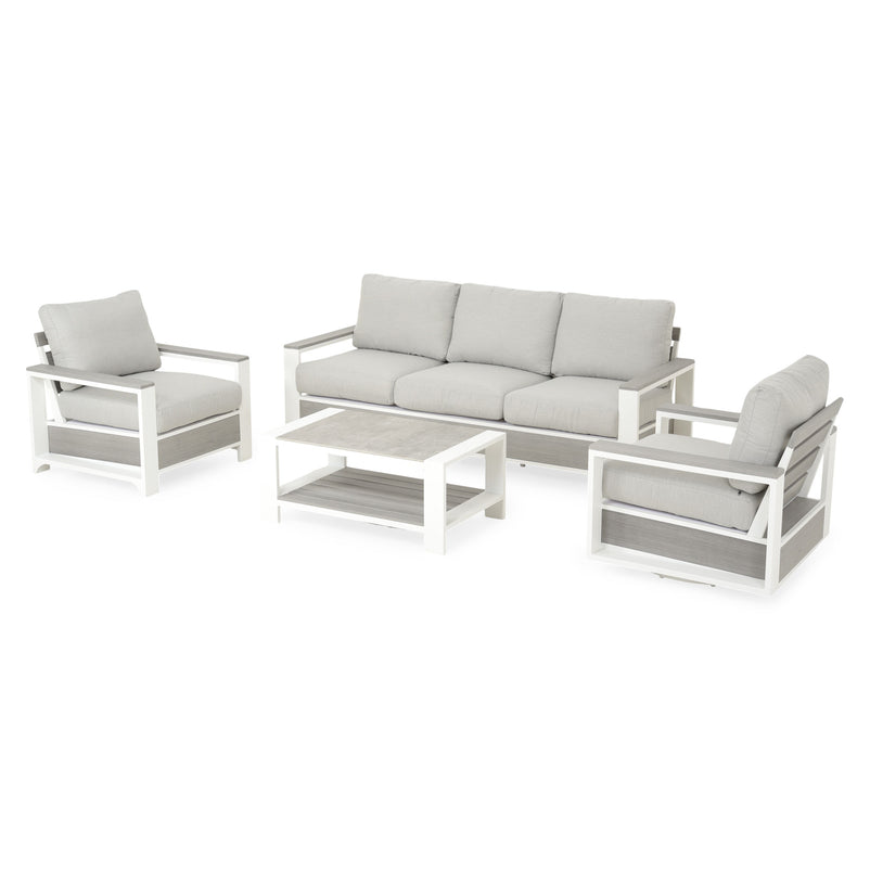 Set mobilier terasă/grădină, 2 fotolii, canapea și măsuță Kendalle. Piesele de mobilier pentru terasă și grădină din gama Kendalle se remarcă prin trăsăturile de design moderne, exclusiviste, care nu doar că pun în valoare spațiul înconjurător, dar devin centrul atracției prin tonurile deschise și particularitățile de construcție. Cuvântul de ordine al gamei este "impecabil" și este dat de eleganța câștigată prin sobrietate și simplitate. Designul pieselor, desenate în linii stricte și unghiuri cu înclinații ușoare, demonstrează atenția desăvârșită pentru detaliile care contează pentru voi.