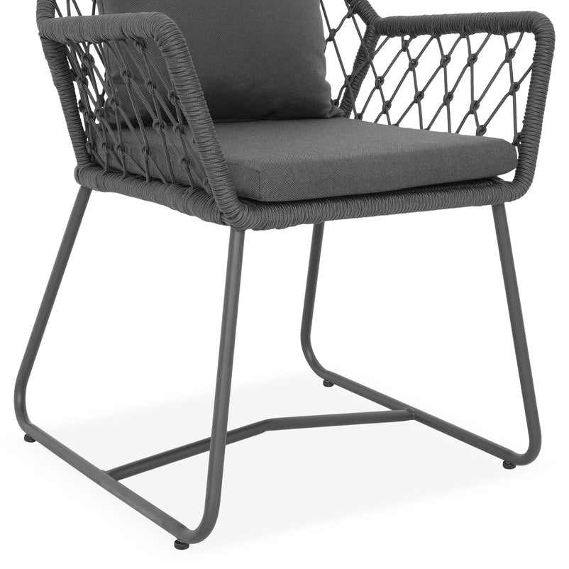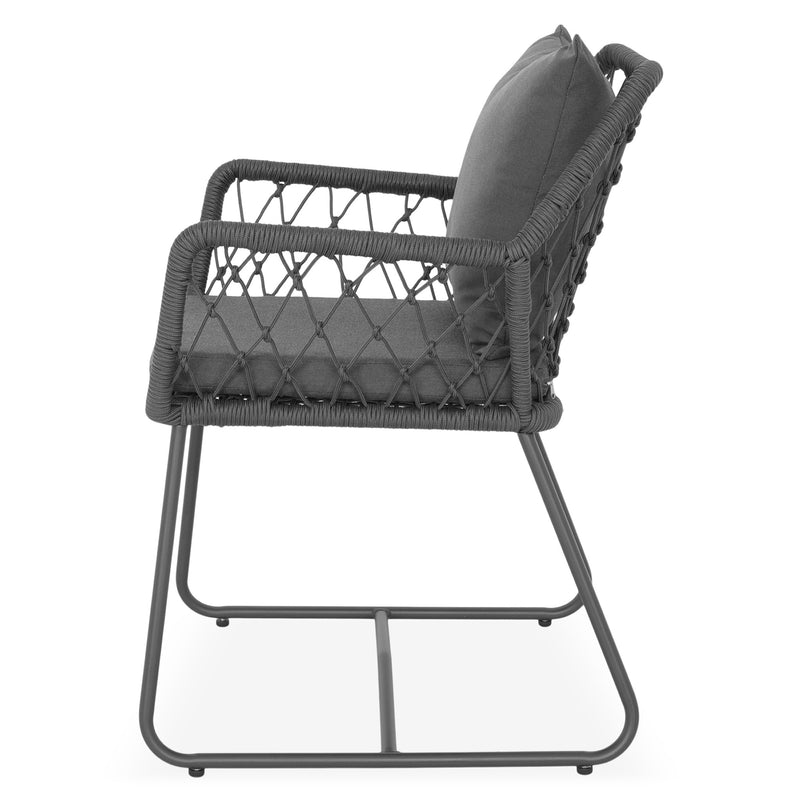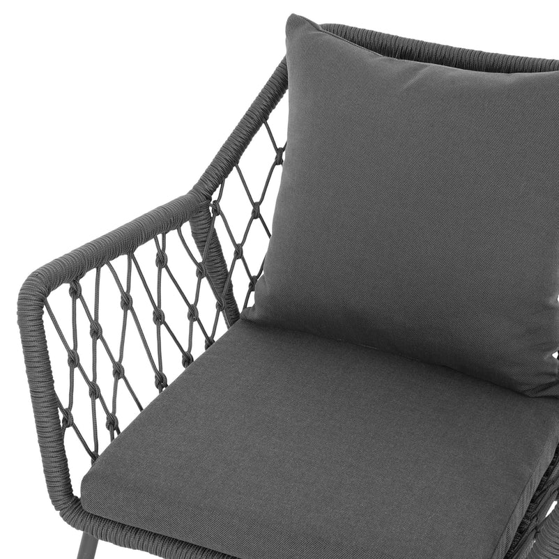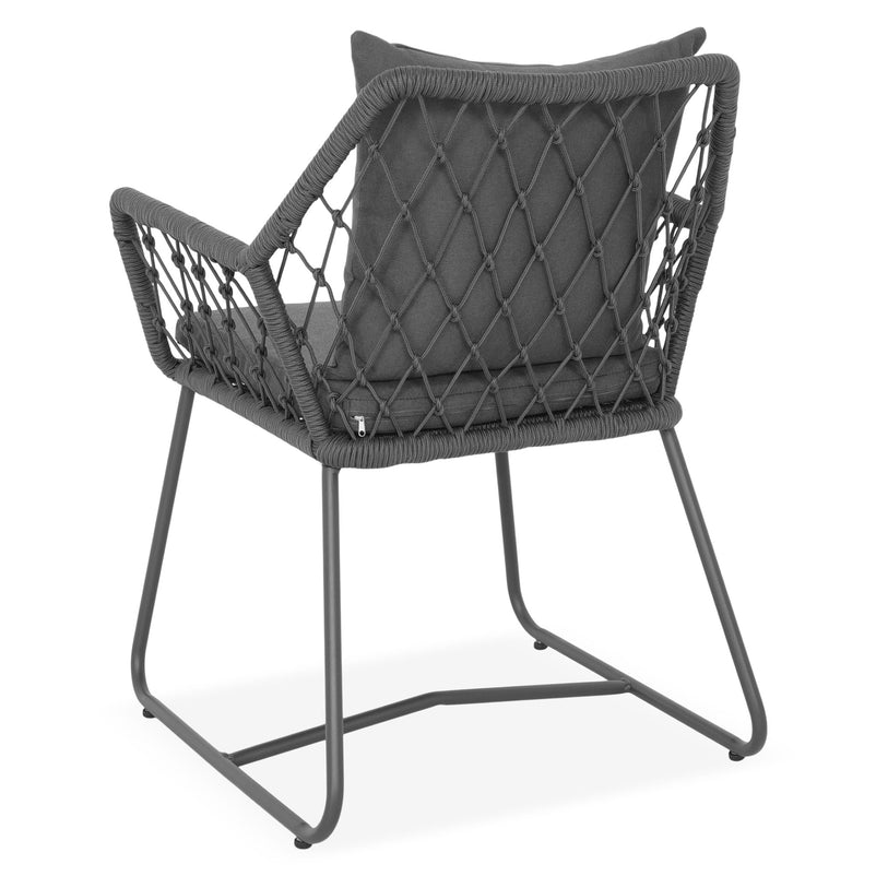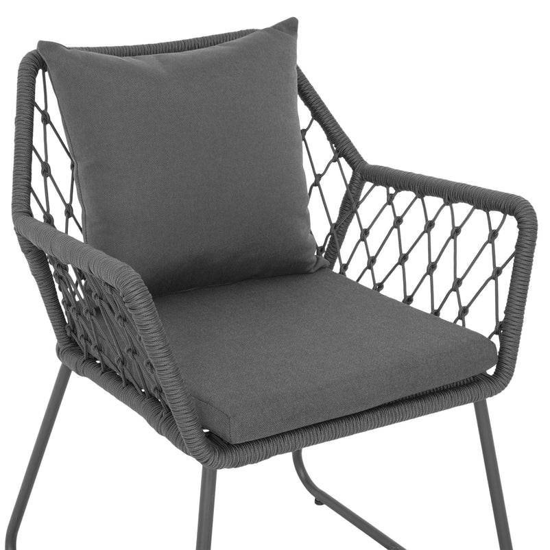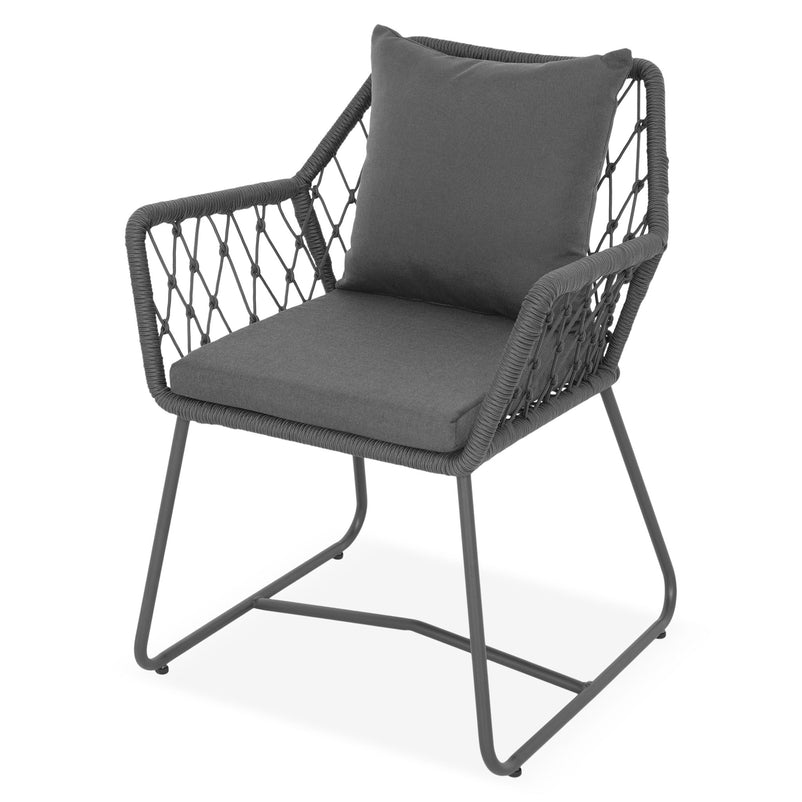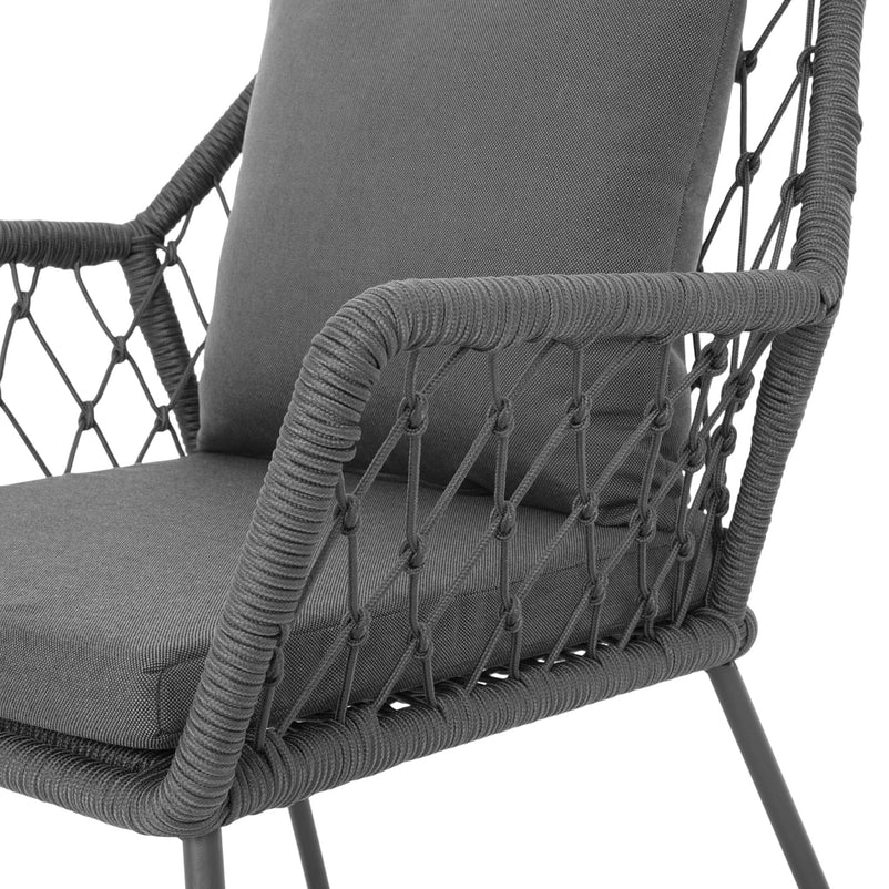 Scaun exterior Elisse. Scaunul Elisse vă oferă un nivel ridicat de confort și relaxare pentru când doriți să petreceți timp în aer liber. Scaunul se remarcă prin cromatica de negru-gri și prin formele asimetrice. Acesta este realizat din structură de oțel vopsită în câmp electrostatic și împletită cu fibre din poliester cu protecție UV și este ideal pentru terasa sau grădina voastră. Include perne confortabile din poliester rezistente la umezeală și UV. Scaunul este suprapozabil și ocupă puțin spațiu la depozitare.