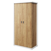 Dulap copii, 2 uși Melina. Dulapul din gama Melina se distinge printr-un design cubic și o construcție masivă, confecționată din panouri aglomerate din lemn melaminat, finisată cu o margine din ABS și mânere gri contrastante. Latura funcțională este bifată de bara de haine, polița lungă și alte 5 polițe scurte, ce îi permit celei mici să își organizeze vestimentația după bunul plac.