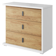 Comodă copii, 3 sertare Melina. Comoda din gama Melina se distinge printr-un design cubic și o construcție masivă, confecționată din panouri aglomerate din lemn melaminat, finisată cu o margine din ABS. Latura funcțională este bifată de cele 3 sertare spațioase ce îi permit celei mici să își organizeze lucrurile după bunul plac.