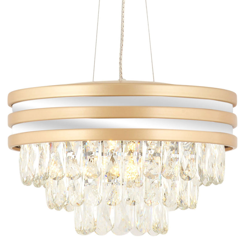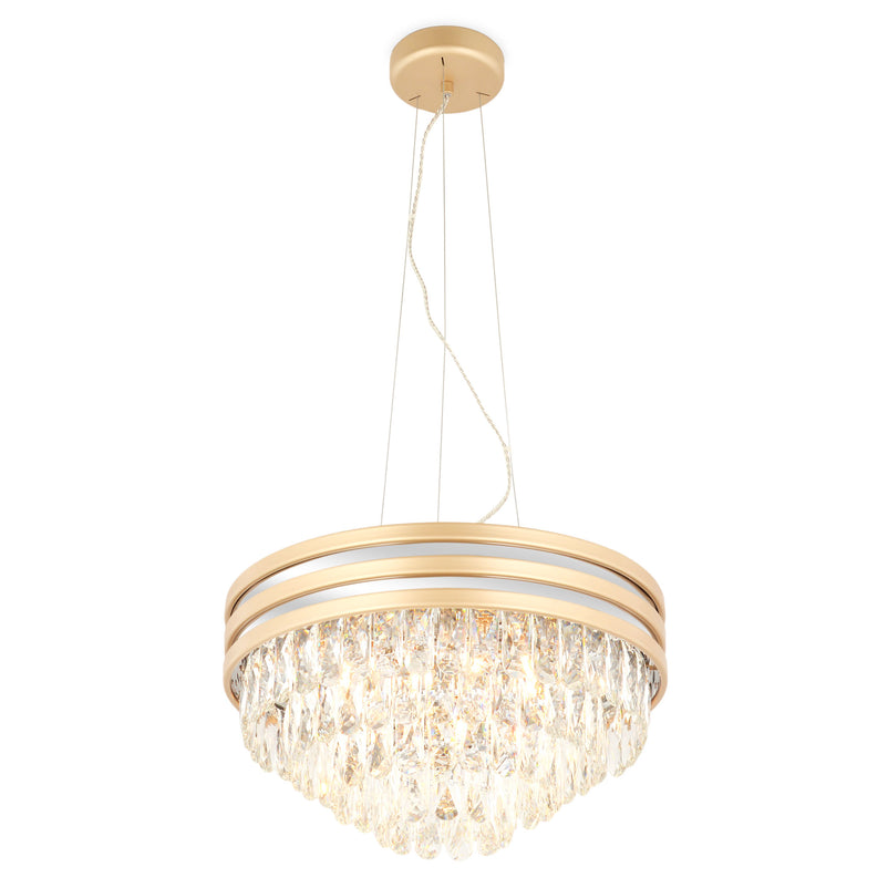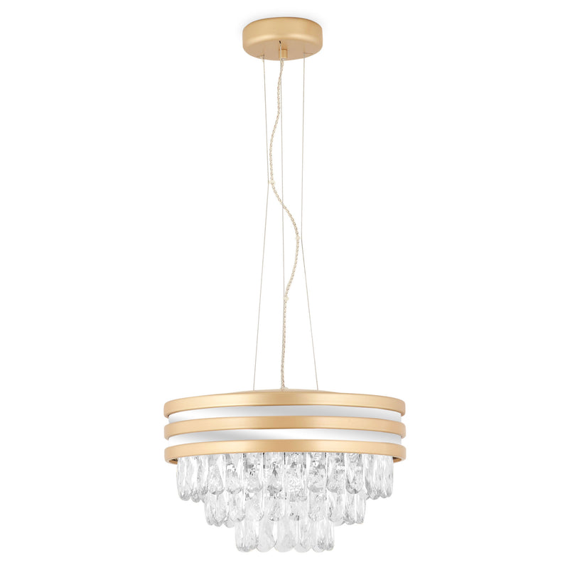 Lustră Kavia. Eleganța și strălucirea lustrei Kavia o recomandă drept corpul de iluminat ideal pentru amenajările moderne. Aceasta are baza și abajurul confecționate din metal de cea mai bună calitate, finisate în auriu satinat și crom sau negru, realizând un adevărat spectacol vizual. Funcționalitatea ei vă permite să vă bucurați de o cameră iluminată corespunzător și de un ambient plăcut.