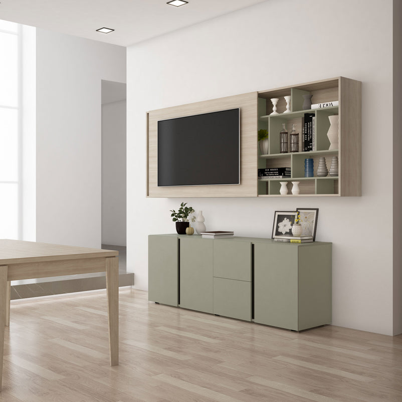 Panoul de susținere TV de L 150x H 96 cm este culisant și se poate deplasa atât în stânga, cât și în dreapta.