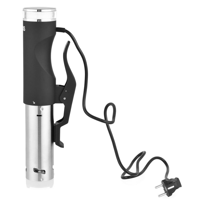 Aparat pentru gătit Sous Vide. Sous Vide este o tehnică modernă de gătit, în care gătim alimentele în pungi ambalate în vid, scufundate în apă fierbinte. Temperatura de gătire este specificată strict. Tehnica Sous Vide oferă o aromă superioară a alimentelor gătite în casă. Este cel mai bun mod de gătit în care alimentele își păstrează în mod optim gustul, culoarea și textura naturală. Cele mai mari avantaje ale gătitului Sous Vide includ: menținerea nutrienților importanți în mâncare, economisirea timpului și banilor. Această tehnică permite gătitul până la 100 de ore. Puterea nominală este de 800 W, iar temperatura poate ajunge până la 90 °C. Reglarea temperaturii este precisă și ușor de controlat.
