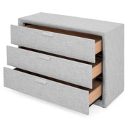 Comodă 3 sertare Caren. Gama de produse Caren este compusă din piese de mobilier esenţiale unui dormitor modern. Patul este însoţit de noptiere, o comodă și o oglindă, toate tapiţate cu stofă gri, de înaltă calitate. Materialul deosebit îi aduce colecţiei un plus de unicitate. Comoda tapițată Caren contribuie cu eficienţă la organizarea dormitorului. Aceasta deţine 3 sertare generoase pentru depozitarea lenjeriei și a articolelor vestimentare și este învăluită în stofă gri, care îi conferă versatilitate și un stil modern. Tapiţeria de înaltă calitate determină ca piesa de mobilier să fie o achiziţie durabilă și de bun gust.