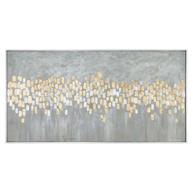 Tablou Parade. Lucrarea va îmbogăți într-un mod deosebit peretele de acasă și va aduce un plus de lumină oricărei încăperi. De asemenea, jocul de pete aurii și argintii parcă imită un ritm, dând camerei o vibrație specială. Tabloul este pictat manual, pe pânză și prins de un suport de lemn. Mixtul cromatic este evidențiat de o ramă subțire, argintie. Datorită naturii artizanale a acestei lucrări, fiecare bucată poate avea diferențe subtile.