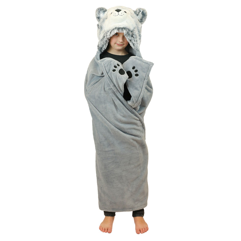Pled cu glugă copii Funny Husky. Realizat din fleece super moale, 100% poliester. Permite-i copilului tău să se relaxeze acoperit de o păturică de formă animăluțului preferat. Păturica include în 2 colțuri câte un buzunar pentru lăbuțele animalului și o glugă de formă capului. Pledul este cozy și călduros, potrivit pe canapea, în pat sau afară lângă piscină. Excelent cadou pentru orice copil, cuminte sau năzdrăvan.