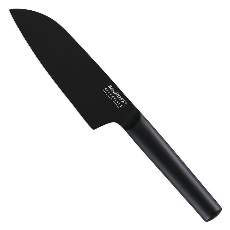 Cuțit santoku Essential. Acest cuțit în stil japonez este un cuțit multifuncțional grozav în setul dumneavoastră de cuțite. Este mai ușor decât un cuțit de bucătar obișnuit, permițându-vă să tăiați sau să tocați mai repede. Datorită lamei late, îl puteți folosi și pentru a zdrobi usturoiul și pentru a colecta ingredientele mărunțite. Mânerul negru asortat se îmbină perfect la lamă, astfel încât nu trebuie să vă faceți griji cu privire la reziduurile de alimente care se blochează în orice crăpătură sau șurub.