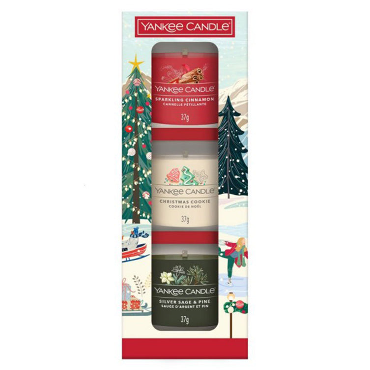 1 x Silver Sage & Pine - salivie, pin, piele, ambra și mușchi; 1 x Sparkling Cinnamon - scorțișoară, cuișoare; 1 x Christmas Cookie - vanilie, scorțișoară, cremă de unt