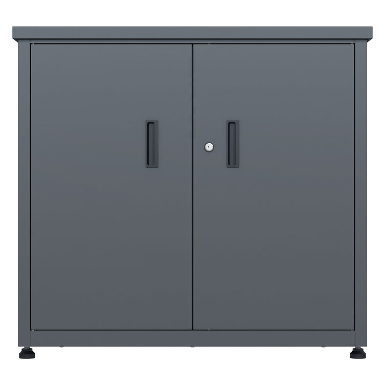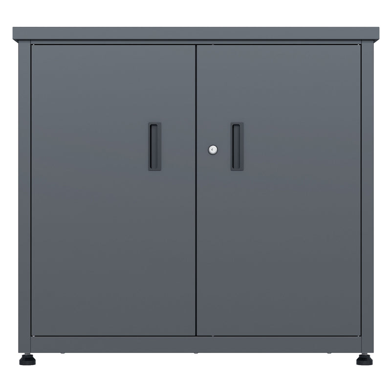 Magazie exterior Citadel. Dulap compact din tablă galvanizată și oțel vopsit în câmp electrostatic, ideal pentru spații tehnice sau industriale. Dispune de rafturi reglabile și picioare ajustabile din PP+inox pentru stabilitate perfectă. Mânerul din aluminiu placat negru și încuietoarea sferică impermeabilă asigură siguranță și confort în utilizare. Structura solidă susține peste 50 kg pe bază și 20 kg pe raft.
