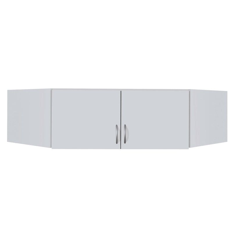 Dulap suprapozabil de colț cu 2 uși Caius. Dulapul suprapozabil de colț cu 2 uși din gama Caius este o piesă de mobilier utilă în dormitorul vostru, putând să stocați hainele sau alte obiecte. Piesa este fabricată din materiale lemnoase rezistente, finisate în alb, designul fiind unul simplu și curat. Ușile sunt prevăzute cu 2 mânere gri, care completează cromatic într-un mod perfect dulapul.