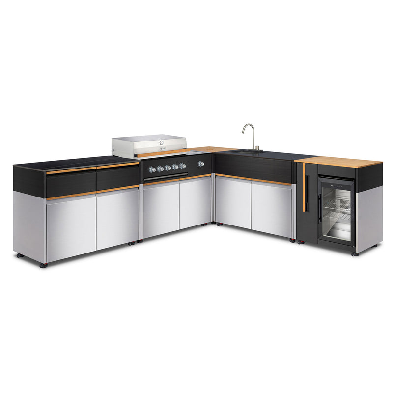 Compoziție grătar 5 piese Element. Realizat din inox, top din piatră sinterizată și lemn de teak. Include grătar pe gaz cu 5 x arzătoare pe gaz + 1x arzător gaz lateral cu infraroșu; spațiu pentru gătit 74X42CM, putere 17.5KW. Grill din inox turnat. Include tavă din fontă. Include un frigider pentru exterior cu o capacitate de 60L (aproximativ 20 sticle de vin). Consum: 3.5kWh