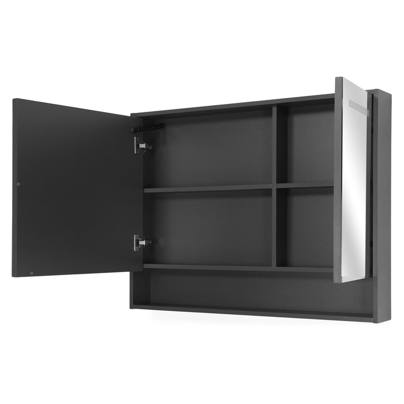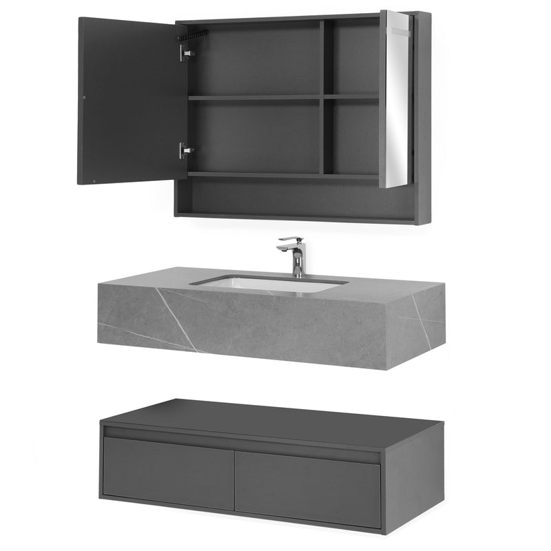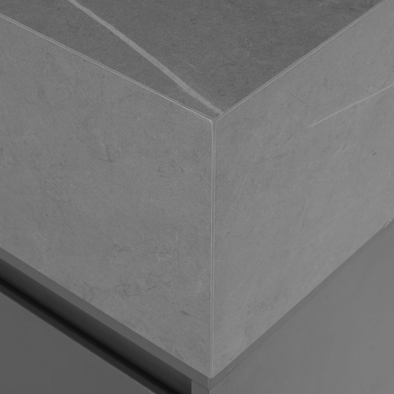 Set mobilier baie, mască lavoar, lavoar și dulap baie suspendat Vulcano. Mobilier realizat din placaj vopsit. Topul este realizat din @sintered stone și include lavoar încastrat din ceramică. Corpul suspendat este prevăzut cu lumină LED.