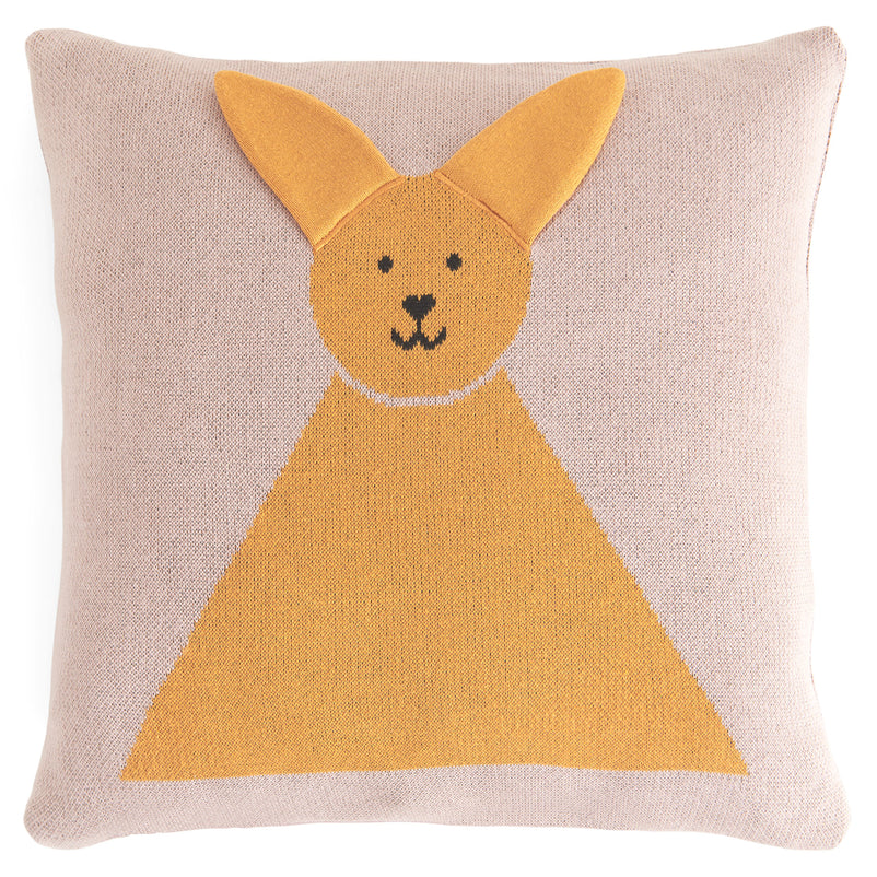 Pernă decorativă Bunny. Materialul tricotat este foarte moale și prietenos cu pielea sensibilă a micuțului, lăsând-o să respire. Pe una dintre fețe are design în forma de animaluț simpatic, cu urechile reliefate. Perna este cozy și atractivă pentru cei mici, putând fi folosită în pat, pe canapea sau în mașină, în excursii. Excelent cadou pentru orice copil.