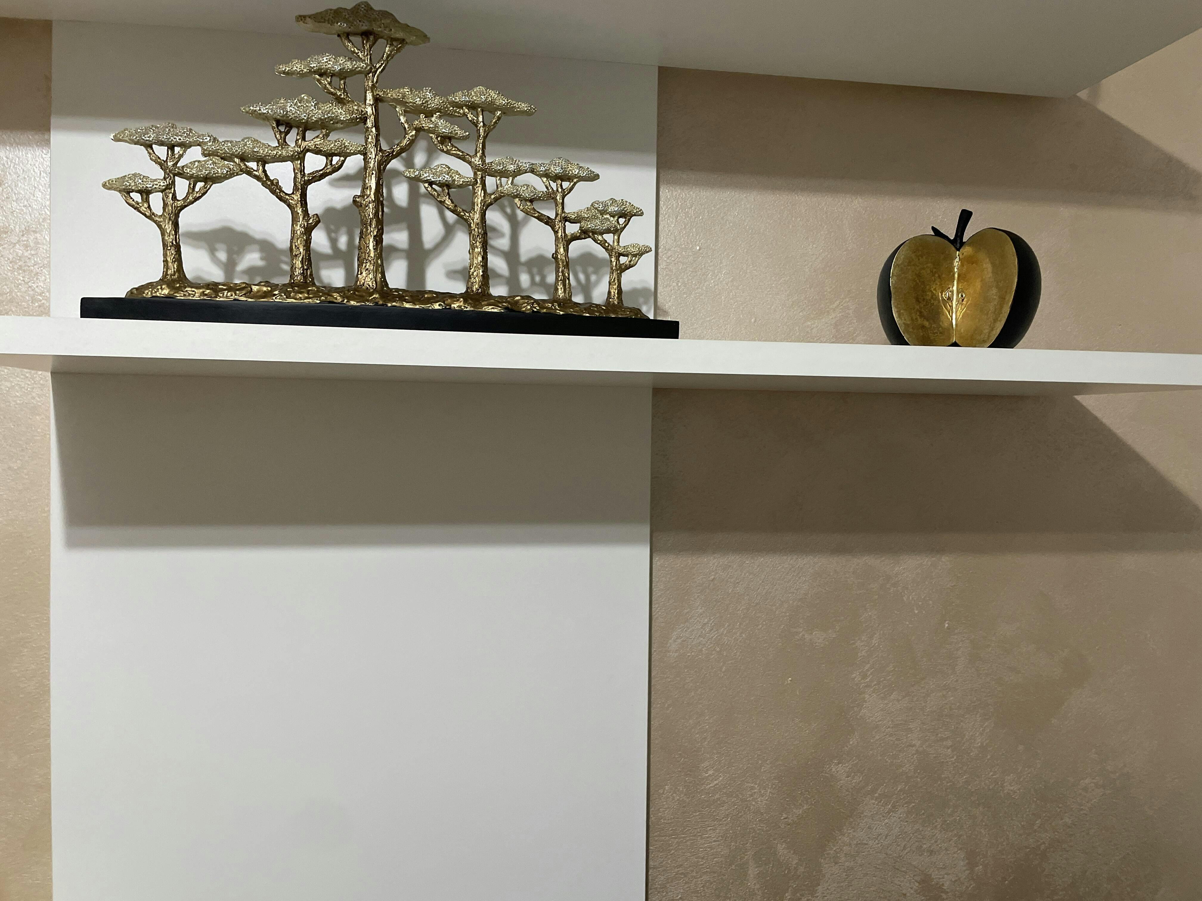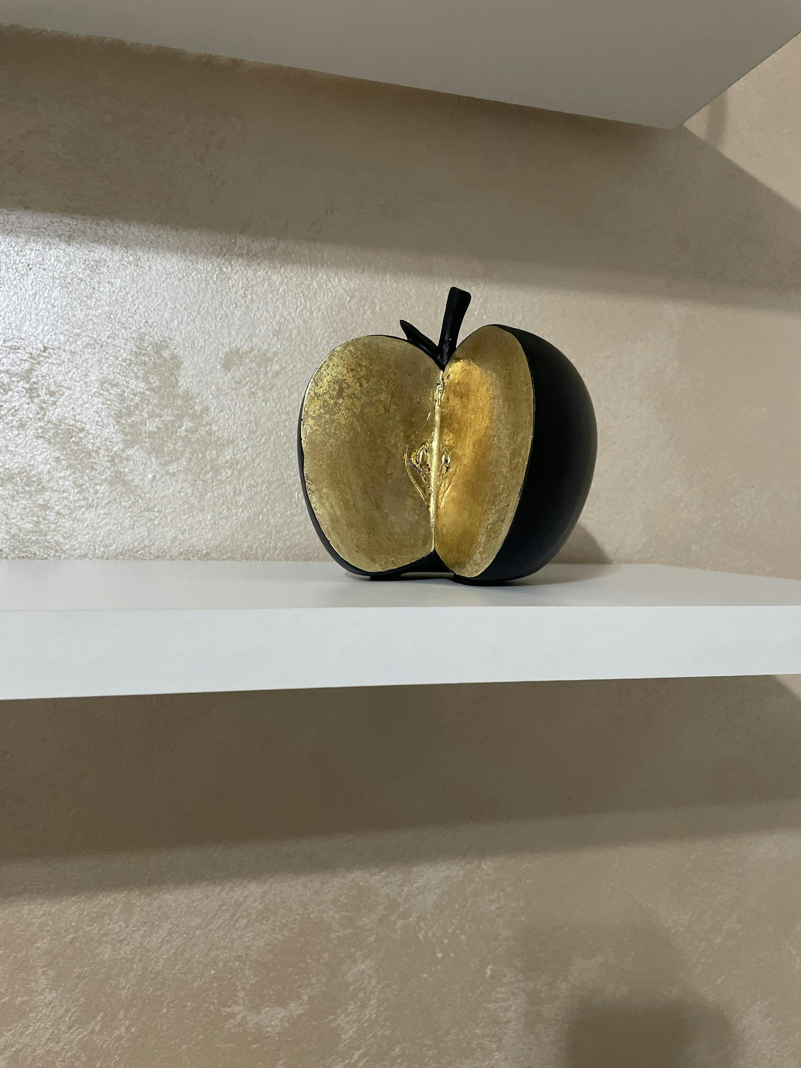 Decorațiune Apple. Decorațiunea Apple adaugă o notă intimă și luxuriantă în decorul camerei voastre. Decorațiunea este realizată din polirășină și are un design în formă de măr în nuanțe de negru și auriu. Aceasta va aduce un plus de autenticitate oriunde o veți așeza.
