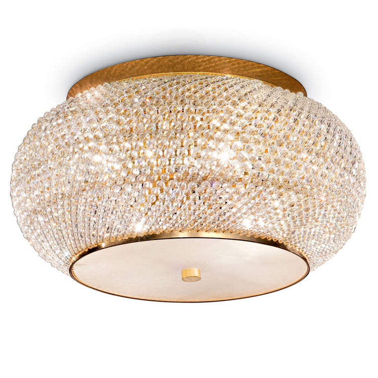 Plafonieră Pasha. Plafoniera din gama Pasha aduce un plus de eleganță și stil în decorul spațiului vostru, pe care îl iluminează eficient și contribuie la un impact vizual deosebit. Plafoniera are o structură de metal, pe care sunt așezate numeroase cristale prin care trece lumina cu finețe. Designul prețios și cromatica versatilă, în nuanțe aurii, o integrează în decoruri dintre cele mai diverse, contribuind la o atmosferă inedită.