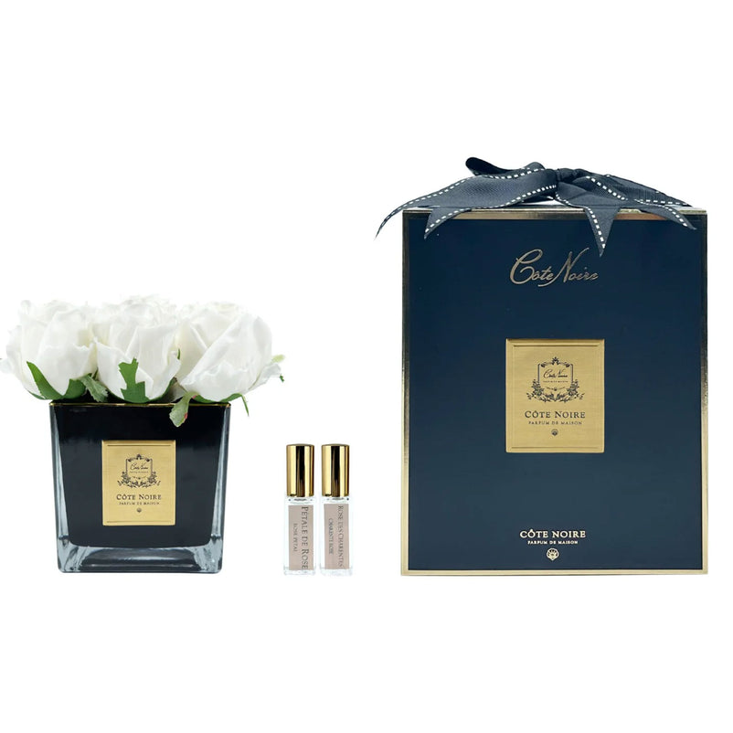 Difuzor parfum cameră Square 9 Roses. Transformă casa într-un paradis parfumat cu acest elegant difuzor de cameră. Acesta este un aranjament floral deosebit, compus din 9 trandafiri parfumați, de un alb imaculat, care împrăștie un parfum subtil și rafinat adăugând o notă de prospețime în orice spațiu. Fiecare floare este confecționată manual și folosește un înveliș special, natural pentru a oferi fiecărei petale o atingere și un aspect natural. Vă recomandăm să clătiți aranjamentul floral din când în când pentru a curăța praful de pe petale și pentru a menține țesătura aranjamentului umedă. De asemenea, se recomandă să pulverizați petalele cu apă în mod regulat pentru a minimiza uscarea petalelor.