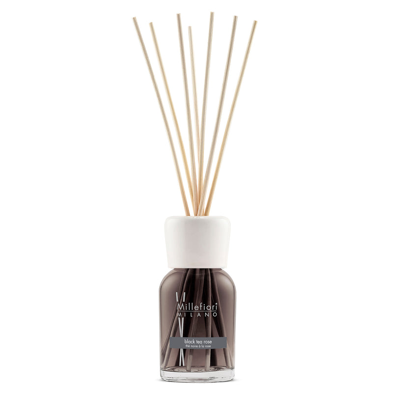 Difuzor parfum cameră Black Tea Rose. Un parfum care transmite un sentiment de rafinament și confort, inspirat de ceaiuri rooibos negre și roșii parfumate care se amestecă cu o notă catifelată din parfum de trandafir alb. Nota de bază are un acord lemnos care îți îmbată simțurile. Aroma BLACK TEA ROSE: Notele ușoare și aromate inspirate de ceaiul negru și salvie albă sunt combinate cu nuanțe picante din parfumul de chai și sunt cuibărite cu note florale evocate de trandafir alb. Lăsând în urmă o bază caldă care amintește de note de scoarță, palo santo și lemn de santal.