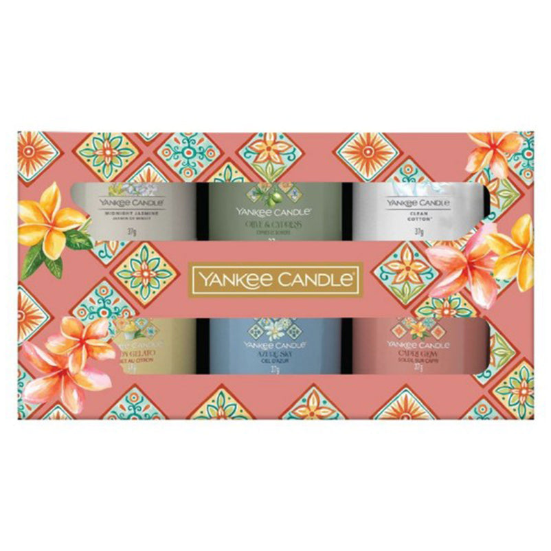 1 x Capri Glow - ambră, frangipani, coajă de citrice; 1 x Azure Sky - mango, nucă de cocos, tuberoză; 1 x Lemon Gelato - lămâie, citrice; 1 x Olive & Cypress - măslin, rozmarin, chiparos; 1 x Clean Cotton - bumbac, flori albe, lămâie; 1 x Midnight Jasmine - iasomie, caprifoi, neroli, floare de mandarin