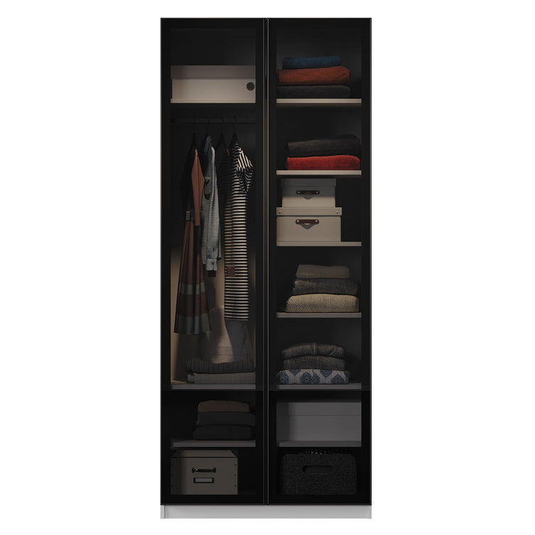 Dulap copii, 2 uși Valery. Realizat din PAL melaminat cu grosimi de 18 și 25 mm, finisaj alb. Dotat cu bară de haine iluminată cu LED-uri, acționată prin senzori și mânere elegante metalice. Este utilat cu 1 poliță lungă + 6 polițe scurte + 1 bară haine. Camera se distinge prin contrastul de culori alb-negru și formele rotunjite ale corpurilor, dublate de picioarele suple și înalte, metalice. Prin alăturarea dulapurilor cu 1 ușă, 2 uși, de colț, sau 3 uși se poate obține un dressing spațios, care va acomoda toate lucrurile copilului. Ușile de sticlă ale dulapurilor sunt realizate din sticlă securizată de grosime 5 mm, culoare fumurie cu opacitate 20–30%, care oferă vizibilitate asupra interiorului dulapului, dar estompează contururile și culorile lucrurilor. Mânerele sunt metalice, simple și elegante. Un copil energic are nevoie de soluții de depozitare funcționale. Majoritatea pieselor includ sertare adânci, ușor accesibile, dotate cu soft-closing. Toate piesele disponibile: paturi 120x200 cm și junior 90x190, noptieră, dulap, birou și suprapozabil, comodă cu sertare, etajeră înaltă 1 ușă, dulapuri cu 3 sau 4 uși, vor organiza judicios toate lucrurile copilului.