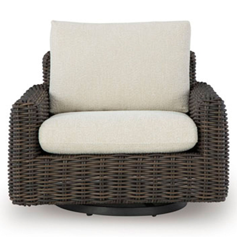 Fotoliu rotativ exterior KIMORA. Fotoliul rotativ Kimora adaugă un echilibru perfect între lux, confort si rezistență, fiind ideal pentru orice spațiu exterior. Conceput pentru a reda textura naturală a ratanului, acest set își păstrează eleganța în timp și este construit să reziste la orice condiții meteorologice, de la soare intens la ploi abundente. Fabricat din materiale rezistente la UV, acest fotoliu își menține aspectul impecabil de-a lungul anilor. Țesătura Nuvella, special conceputa pentru exterior, este ușor de întreținut și oferă un plus de durabilitate. Designul cu șezut adânc și spațios asigură confort maxim, oferind suficient loc pentru relaxare totală. Fie ca organizezi o întâlnire cu prietenii sau te bucuri de momente liniștite în aer liber, Kimora combină stilul și funcționalitatea, transformând orice terasă sau grădină într-un spațiu sofisticat și confortabil.