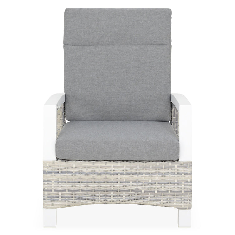 Fotoliu cu recliner manual Baku. Fotoliul Baku este alegerea ideală pentru ca voi să vă bucurați de momente de relaxare în compania celor dragi. Fotoliul este realizat din structură de aluminiu vopsită în câmp electrostatic pentru o rezistență și durabilitate de lungă durată. Latura estetică este oferită de împletitura cu fibre sintetice ce imită ratanul, rezistente la razele UV. Confortul deplin și comoditatea sunt redate de pernele incluse, confecționate din țesătură Olefin, rezistente la umezeală și decolorare care sunt accesorizate cu fermoar pentru o curățare și îndepărtare ușoară a impurităților. Spătarul scaunelor se poate regla în funcție de preferințele voastre, grație pompei de gaz inclusă.