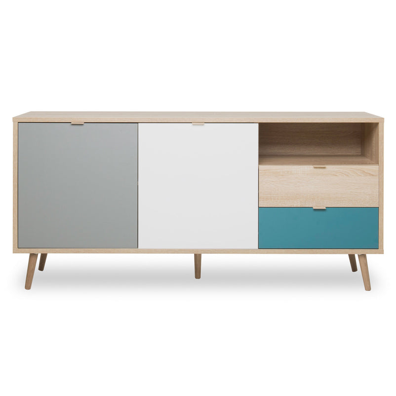Bufet 2 uși, 2 sertare Kultur. Culoare, funcționalitate și estetică - acestea sunt caracteristicile de bază ale bufetului Kultur. Realizat din panouri aglomerate din lemn, acesta este completat cu mânere din plastic și picioare conice din lemn masiv. Bufetul Kultur este o piesă de mobilier ideală pentru orice spațiu, grație aspectului său inedit.