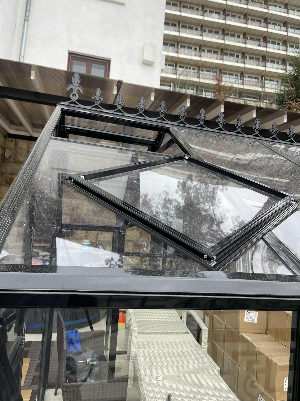 NOTA: O seră/oranjerie este o structură simplă cu un singur strat care nu este 100% impermeabilă. Pot exista scurgeri la luminatoare și îmbinări de pe acoperiș. Cu alte cuvinte, omisiunile nu sunt eligibile pentru reclamație.