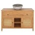 Lavoarul din marmură Orchid Hammered se asortează perfect cu mobilierul din lemn de teak, oferind un contrast armonios între textura netedă a lemnului și cea ciocănită a marmurei.