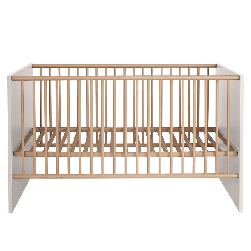 Pat bebe, somieră inclusă Matty. Somn ușor, puisor! Camera copii Matty, având culori și materiale naturale foarte prietenoase, va fi îndrăgită de toți părinții! Suplă și trainică, va aduce atmosfera liniștită, sigură și caldă pe care orice mamă o dorește pentru copilul ei în primii ani de viață. Camera bebe include patul, comoda cu suport înfășat și dulapul cu 3 uși. Mobilierul se distinge prin design suplu, cu picioare înalte și un finisaj alb și este realizat din PAL melaminat finisat cu cant rezistent ABS. Mânerele și picioarele înalte H21cm sunt realizate din lemn masiv de fag, finisaj natural, contrastând plăcut cu fronturile albe. Patul bebe include somiera cu lamele elastice din lemn. Aceasta somieră este reglabilă pe înălțime în 3 poziții facilitând accesul părinților la copil în perioada 0-2 ani. De asemenea, acesta are 3 bare demontabile pentru perioada când copilul va începe să meargă singur. Siguranță garantată prin certificatul TUV.