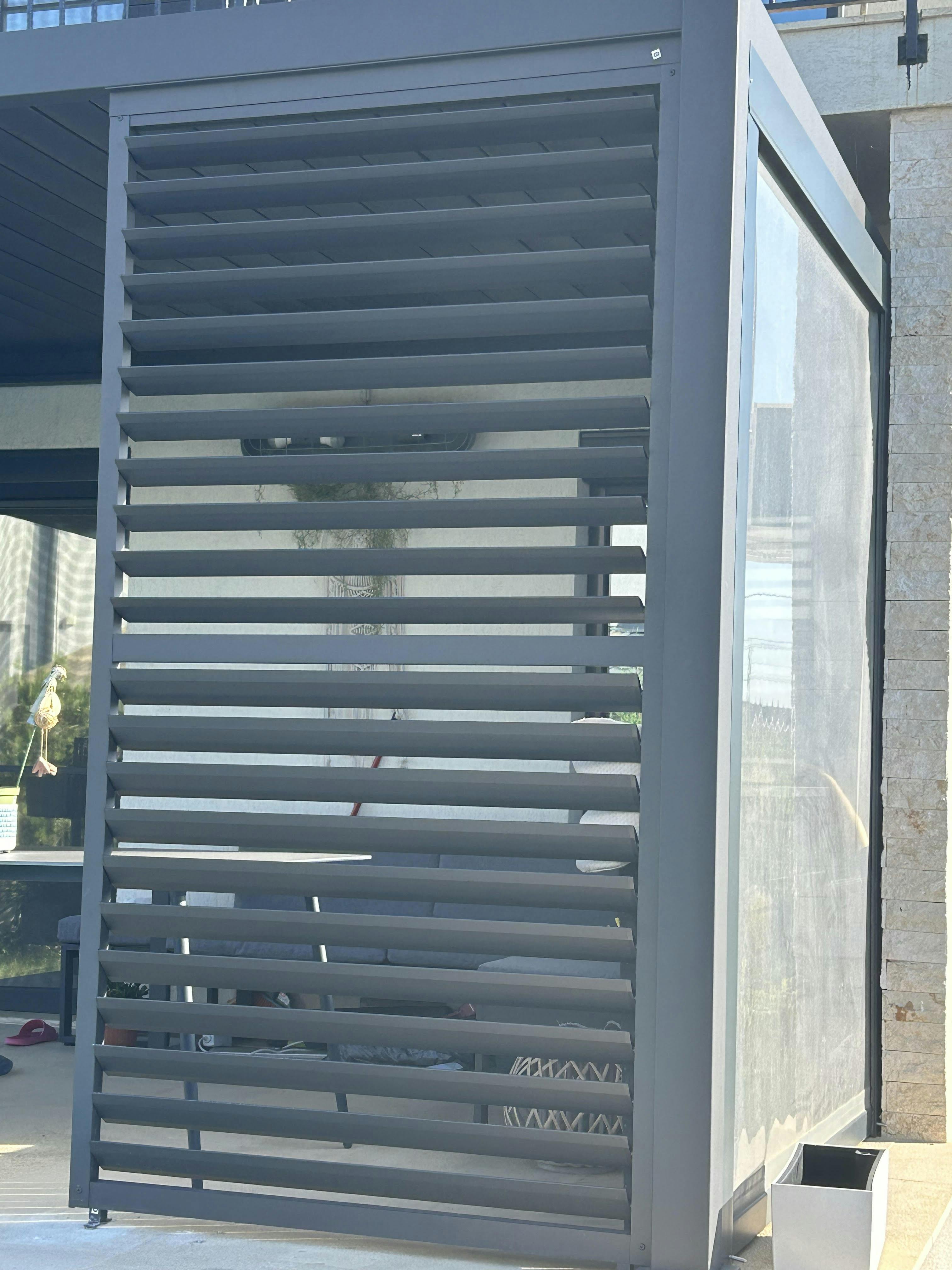 Panou reglabil aluminiu pergolă Mirador Gold/Premium. Realizat integral din aluminiu. Potrivit pentru pergolele Mirador Premium/Gold pentru laturile de 400cm. Sunt necesare 3 buc pentru o latură de 400cm. Lamelele se pot închide/deschide.