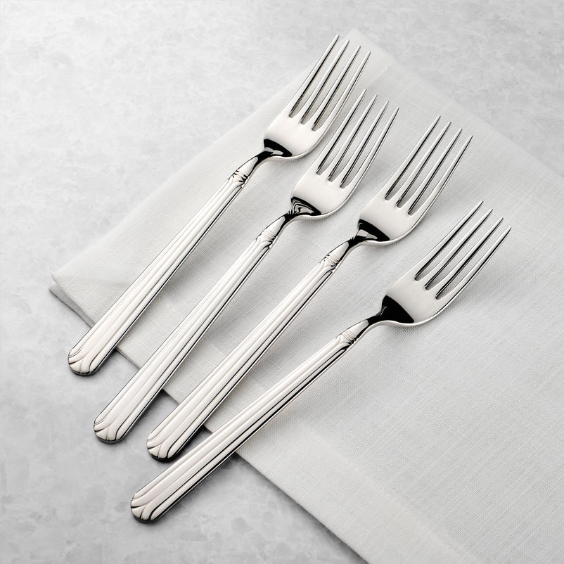 Set 4 furculițe Splendido. Colecția voastră pentru diningul ideal cupinde tacâmurile care transmit eleganță, rafinament, stil și personalitate. Setul de furculițe din gama Splendido vor transforma experiența servirii preparatelor mult îndrăgite într-o defilare de gală, plină de sclipire, remarcată prin designul modern, minimalist, și atributele unice ale detaliilor inserate pe mânere.