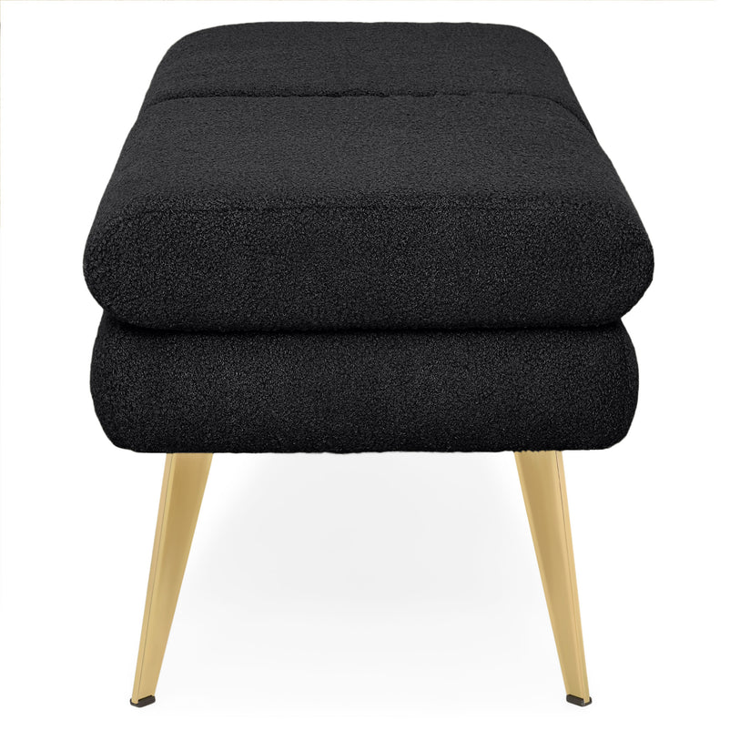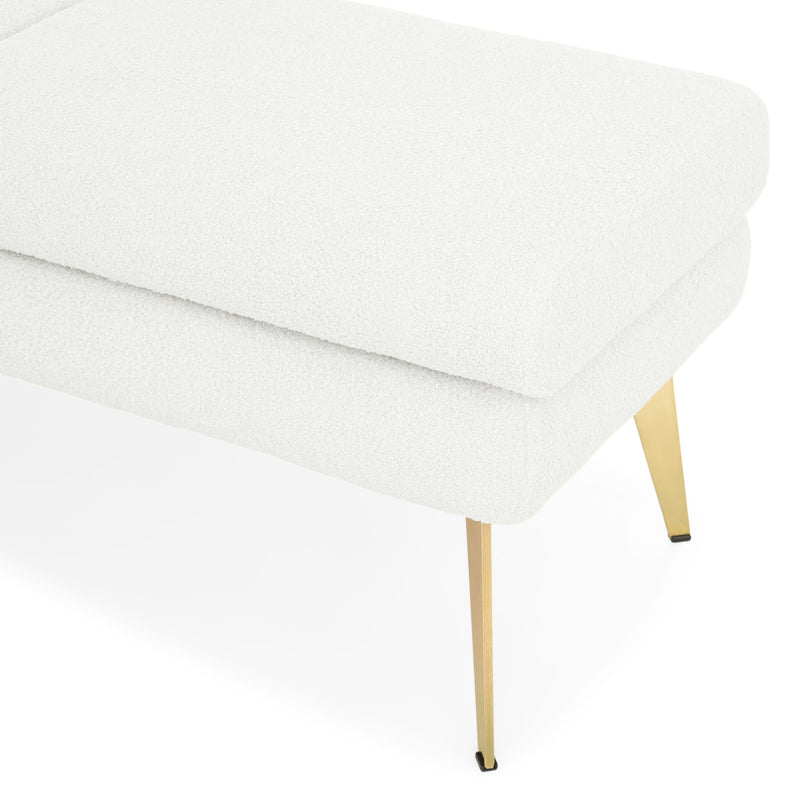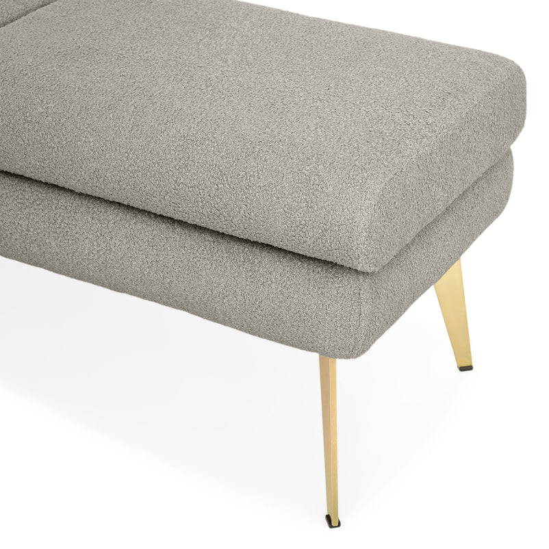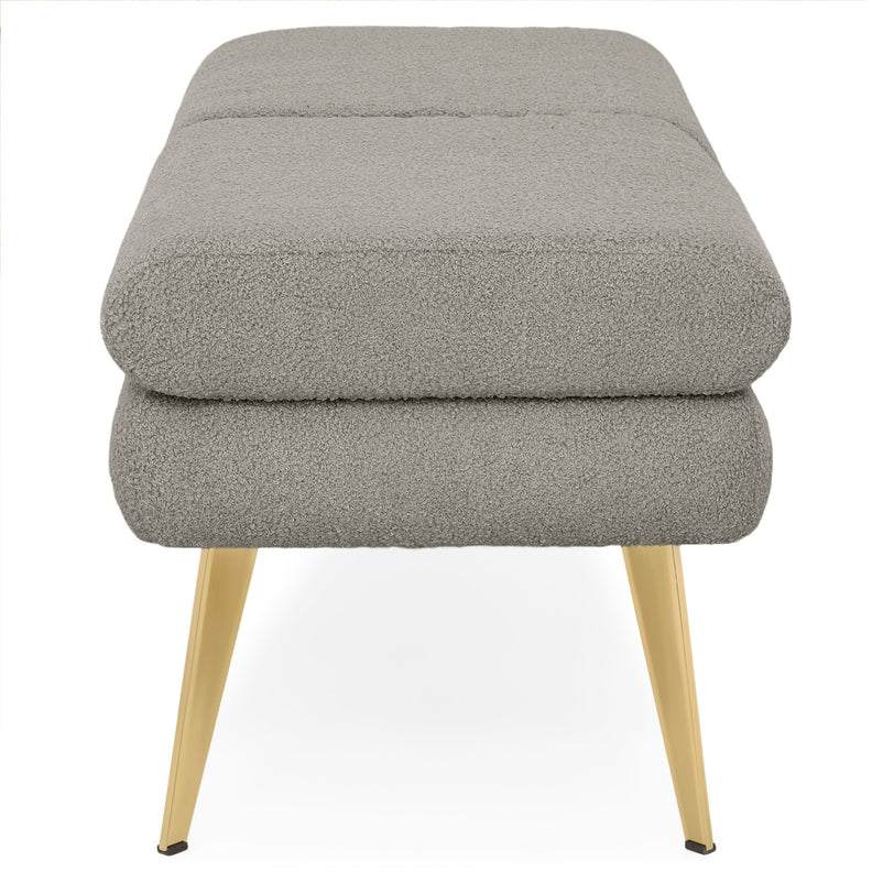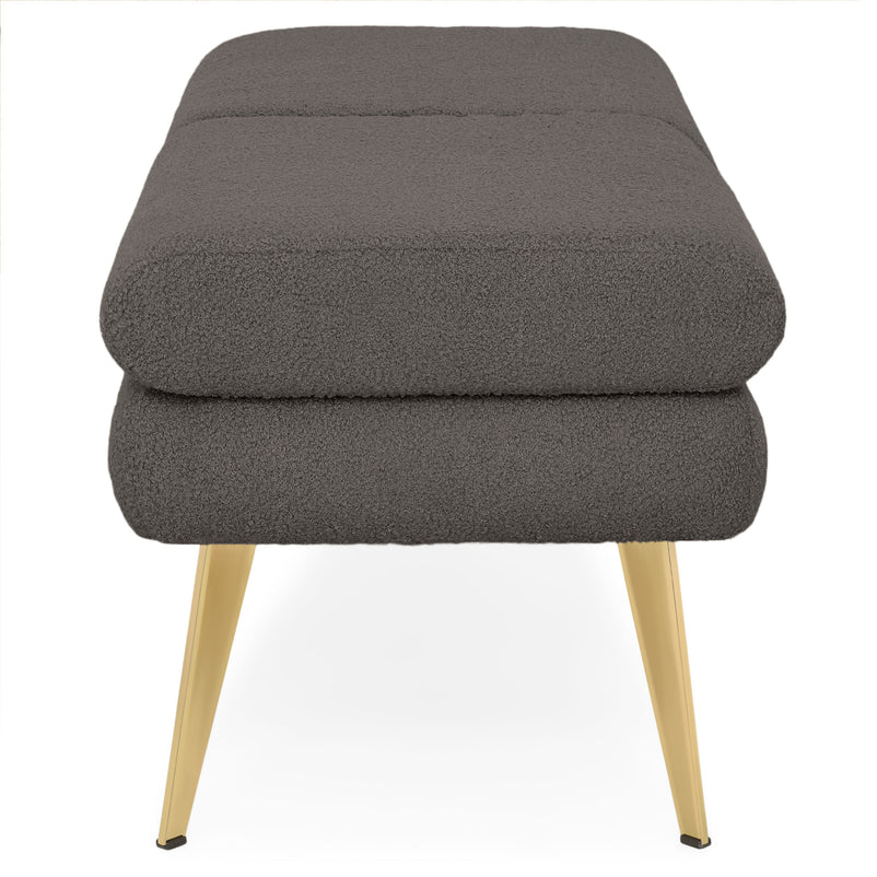 Bancheta Adelyne. Model modern tapițat în stofă. Vă puteți selecta nuanța preferată de tapițerie dintr-o varietate de texturi și culori pentru amenajarea dormitorului așa cum vă doriți. Pentru un plus de eleganță și confort se pot alege forma și culoarea picioarelor banchetei, alb, negru sau auriu. Fabricat în România.