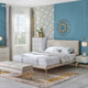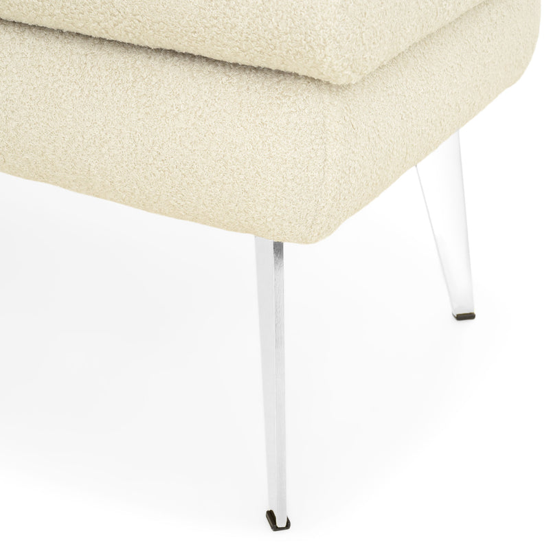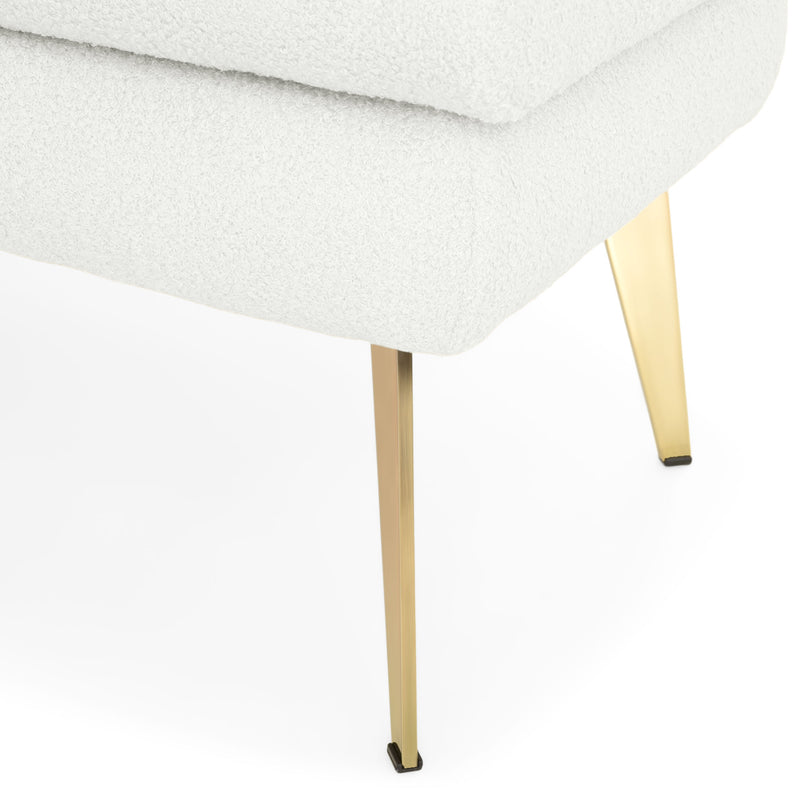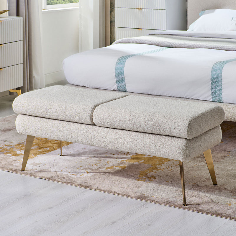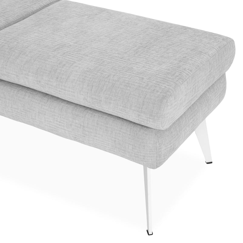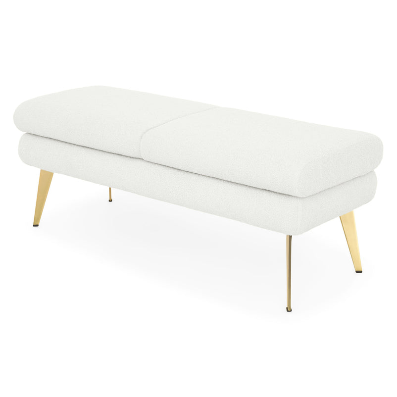 Bancheta Adelyne. Model modern tapițat în stofă. Vă puteți selecta nuanța preferată de tapițerie dintr-o varietate de texturi și culori pentru amenajarea dormitorului așa cum vă doriți. Pentru un plus de eleganță și confort se pot alege forma și culoarea picioarelor banchetei, alb, negru sau auriu. Fabricat în România.