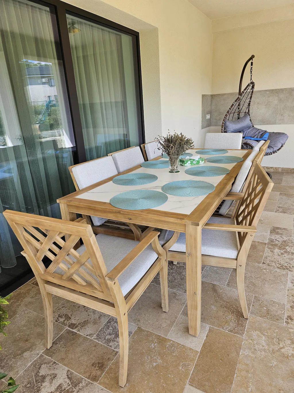 Realizat din lemn masiv de acacia, acest set impresionează prin durabilitate și farmec natural, integrându-se armonios în orice spațiu exterior. Scaunele tapițate cu stofă din poliester rezistent și perne din spumă și fibre moi asigură un confort de neegalat, perfect pentru mese prelungite în compania celor dragi. Masa de dining este accentuată de un blat ceramic elegant, oferind un plus de stil și rezistență în timp.