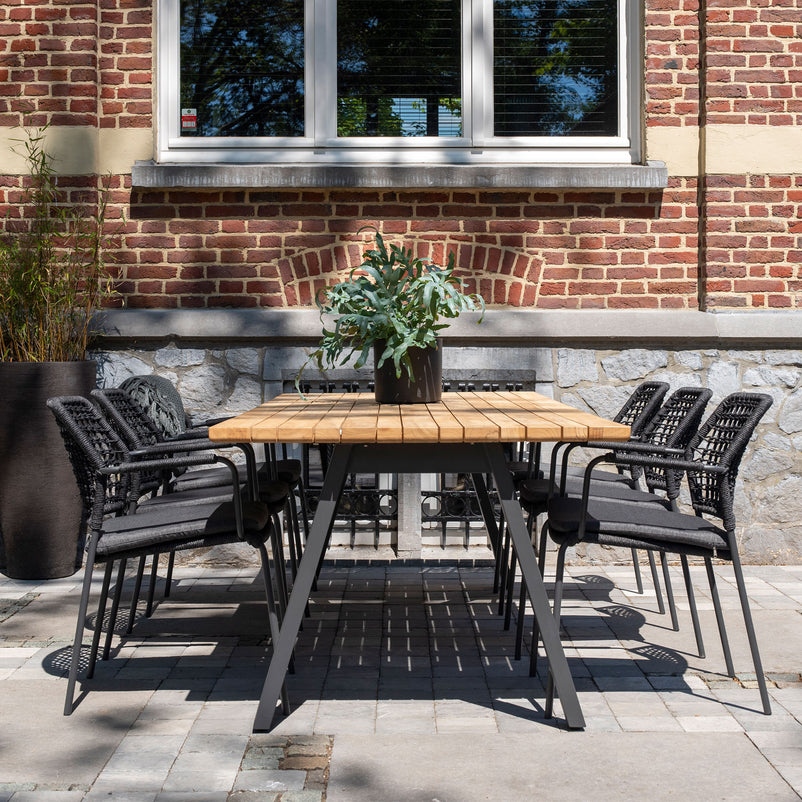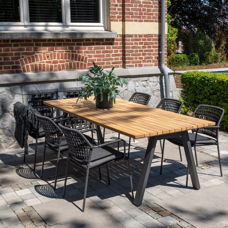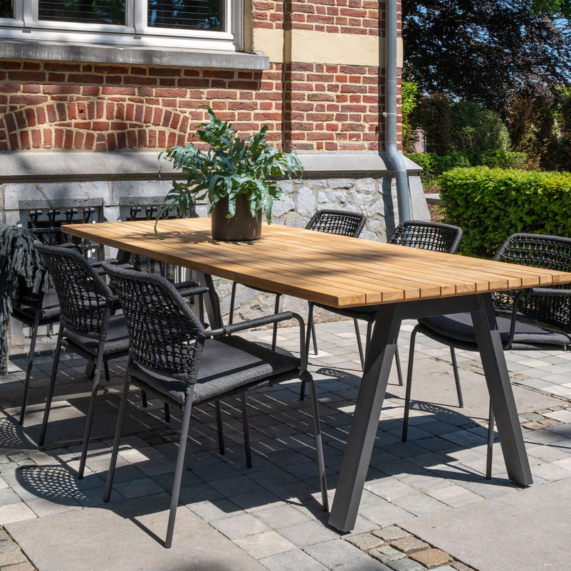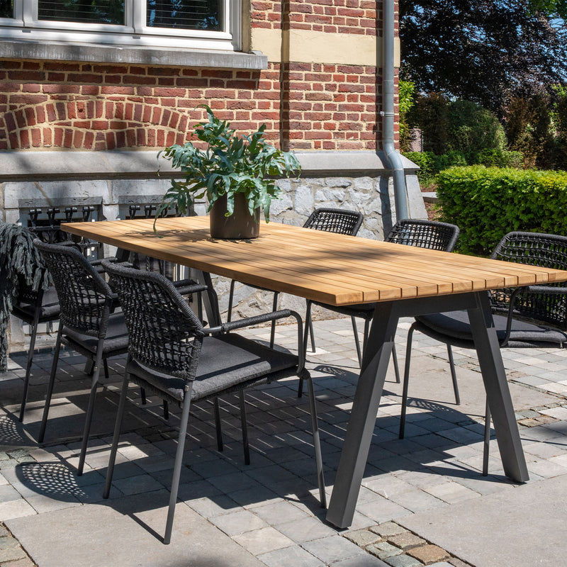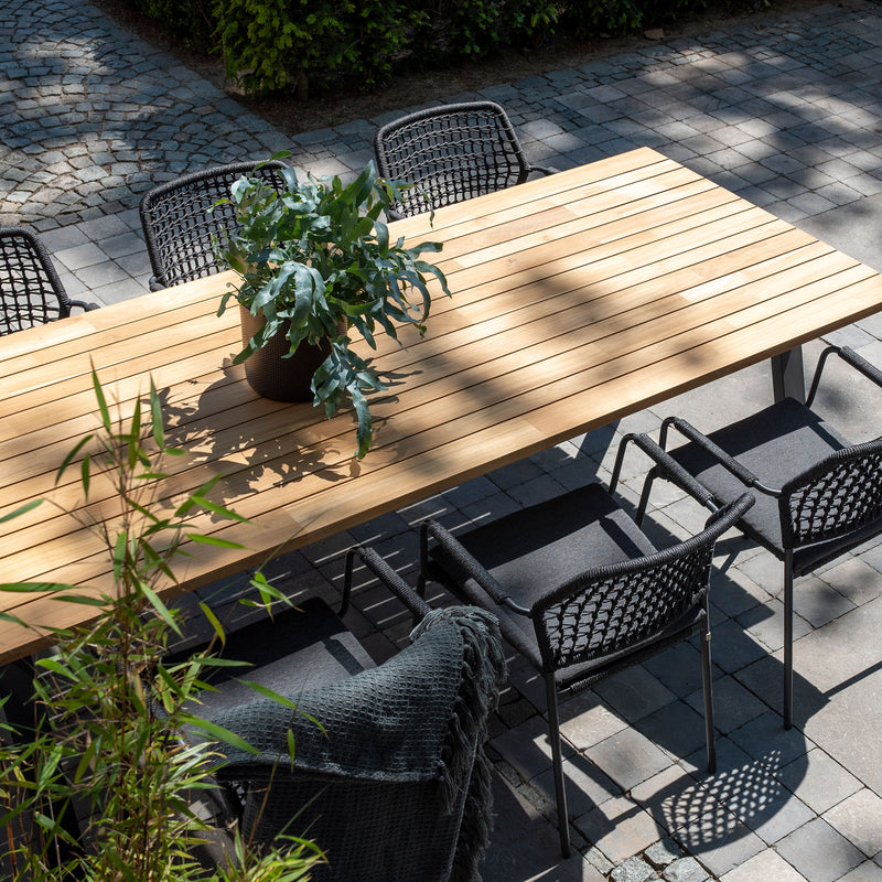 Masă exterior Ambassador. Piesele mobiliere din gama Ambassador îmbină stilul cu funcționalitatea. Designul natural al mesei o integrează ușor printre plantele preferate sau copacii înfloriți, iar dimensiunile generoase vă oferă spațiu în plus pentru întreaga familie. Aceasta este realizată din structură solidă de inox vopsită în câmp electrostatic, iar topul mesei este realizat din lemn de teak, material rezistent și durabil, calități care o fac perfectă pentru poziționarea pe terasă sau grădină indiferent de vreme și anotimp. Cu ajutorul mesei dreptunghiulare Ambassador aveți tot ce e necesar pentru a petrece timp în natură, alături de persoanele dragi.