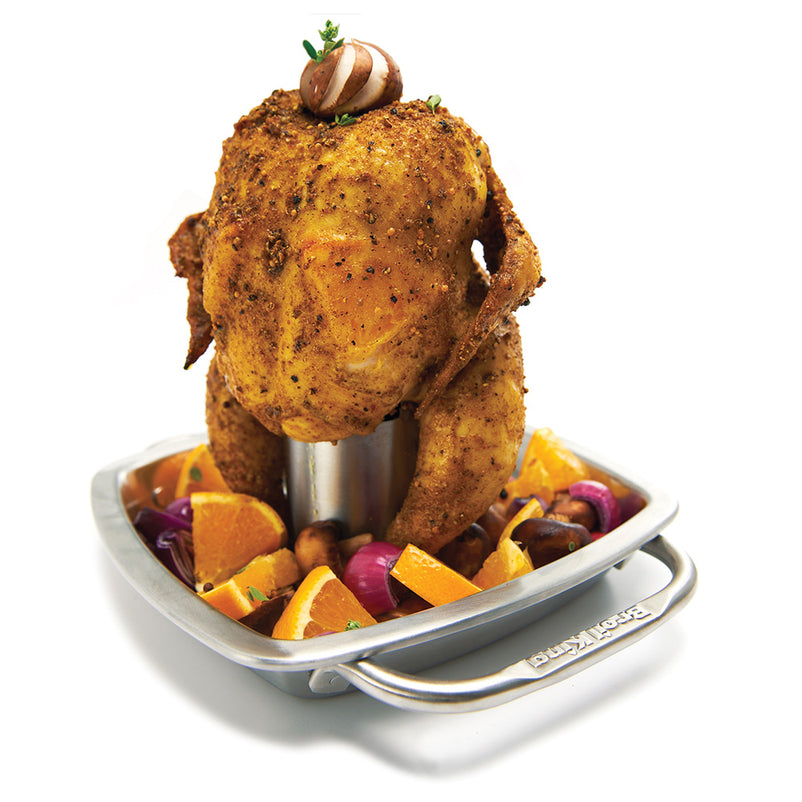 Cel mai bun mod de a gati un pui pe gratar! Include un suport din otel inoxidabil pentru pui dar si legume si vine insotit de un termometru.