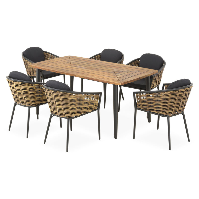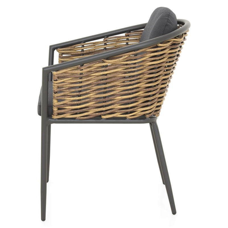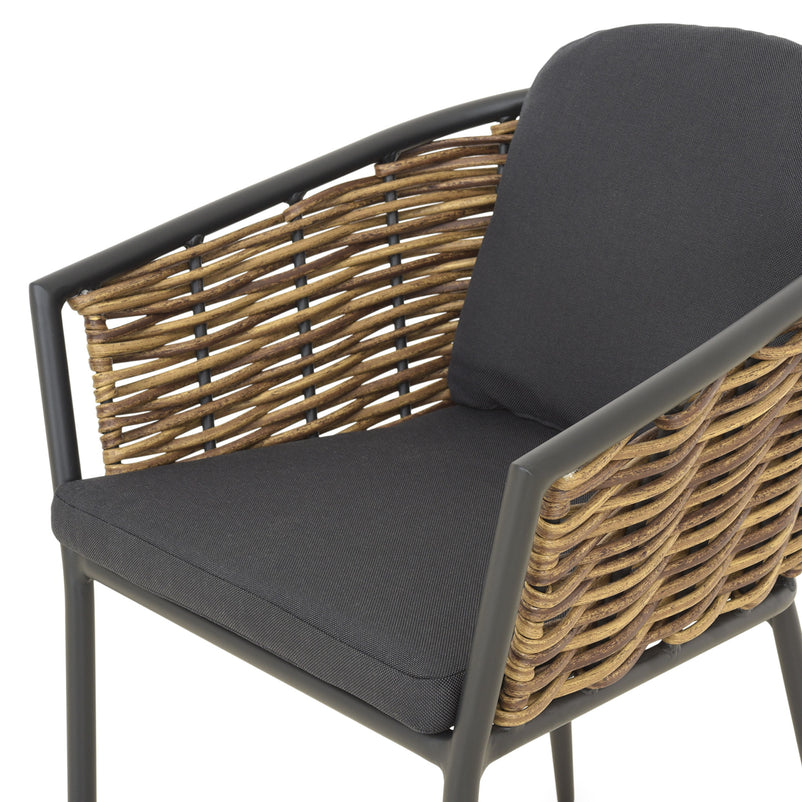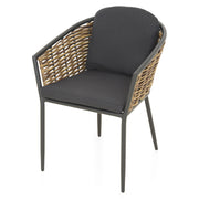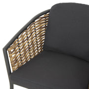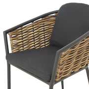 Set mobilier terasă/grădină, 2 scaune Dario. Creați un spațiu elegant și reconfortant pe terasa sau în grădina voastră pentru a vă bucura de experiența relaxării în aer liber pe durata sezonului cald. Scaunele setului pentru exterior din gama Dario sunt realizate din structură din aluminiu, vopsită în câmp electrostatic și împletită cu fibre sintetice ce imită ratanul, tratate împotriva razelor UV. Include pernele din poliester rezistent la umezeală, tratat împotriva decolorării. Topul mesei este realizat din sticlă securizată vopsită în timp ce structura este din aluminiu vopsit în câmp electrostatic.