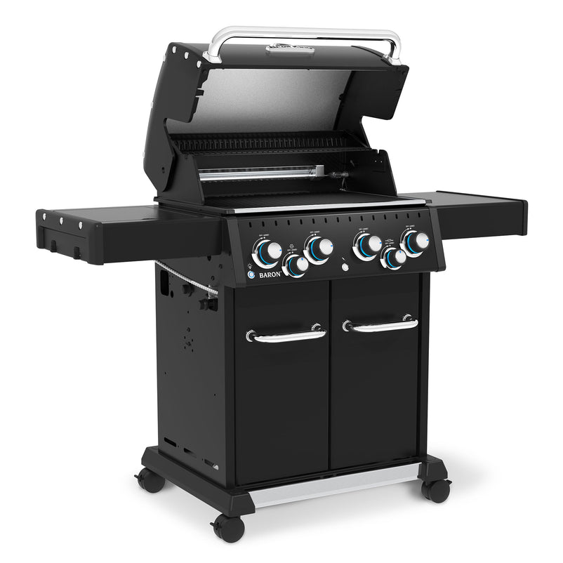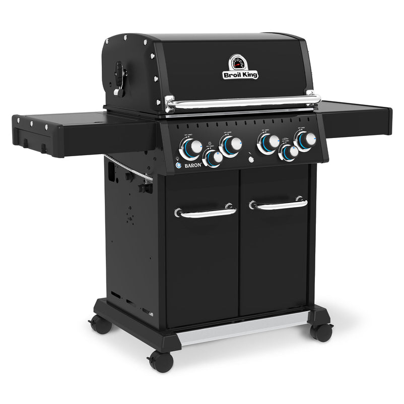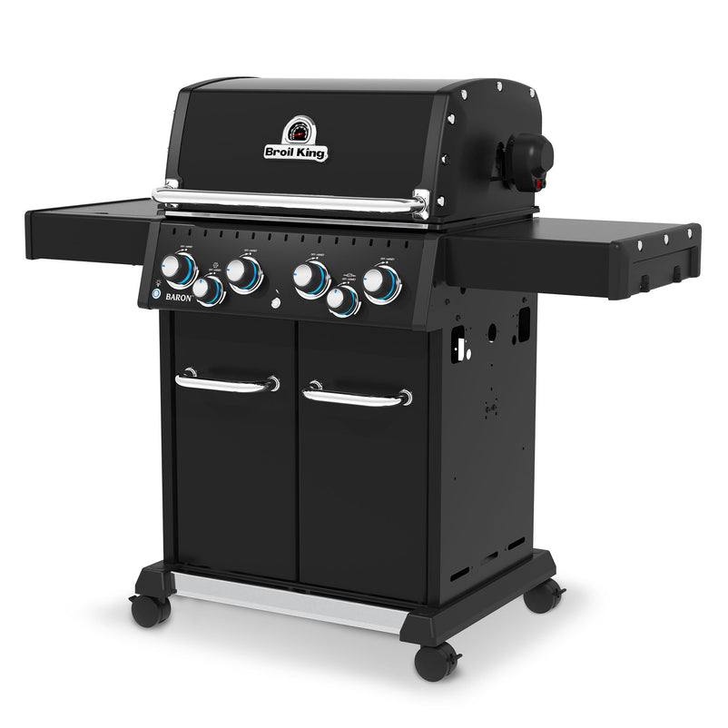 Grătar Baron 490 Shadow Broil King. Seria Baron™ de la Broil King® oferă atât putere, cât și performanță într-o varietate de dimensiuni pentru a se potrivi grătarului pasionat. Baronii includ caracteristici premium standard, cum ar fi un capac cu perete dublu, rafturi laterale, panou de control, mânere din oțel inoxidabil și uși de dulap. Întotdeauna prezent este legendarul sistem de gătit Broil King, care conține grătare de gătit din fontă rezistente, Flav-R-Wave™ din oțel inoxidabil, arzătoare patentate Dual-Tube™ și supape Linear-Flow™ pentru un control precis al gătirii.