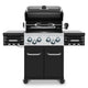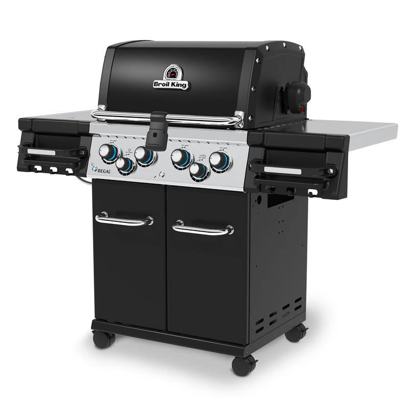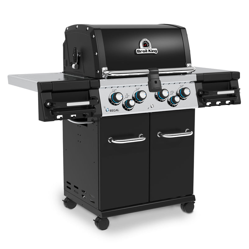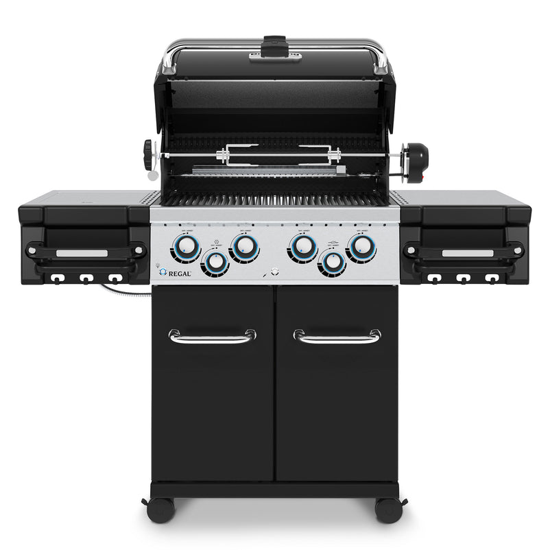 Grătar gaz Regal 490 Broil King. Fabricat în America de Nord. 4484 cm pătrați suprafață totală de gătit, inclusiv suport de încălzire acoperit cu porțelan. Suprafață principală de gătit – 3226 cm pătrați. Suport de încălzire – 1623 cm pătrați. Putere arzător principal: 13,2 kW. Arzător lateral superior: 2,7 kW. Arzător posterior din inox pentru rotisor: 4,4 kW. Include kit premium de rotisor. Cinci arzătoare Dual-Tube din inox. Sistem de gătit Flav-R-Wave din inox 304. Grile de gătit Flav-R-Cast din fontă grea, reversibile. Butoane Linear-Flow cu control Sensi-Touch la 180 de grade. Termometru Deluxe Accu-Temp. Sistem de aprindere electronică Sure-Lite cu dublă-electrodă. Cutie de gătit din inox 304 cu capace laterale din aluminiu turnat. Mânere din inox. Capac din porțelan emailat negru cu capete din aluminiu turnat. Polițe laterale mari, fixe, cu spații pentru condimente și cârlige pentru ustensile. Cabinet și uși din oțel vopsite în câmp electrostatic, capac emailat. Role mari de blocare de 7,6 cm. Componente din oțel zincat, rezistent la rugină. Butoane de control iluminate. Lumină pe mâner inclusă pentru gătit pe timp de noapte.