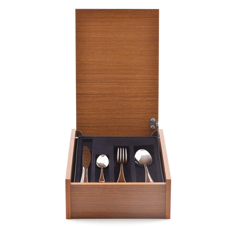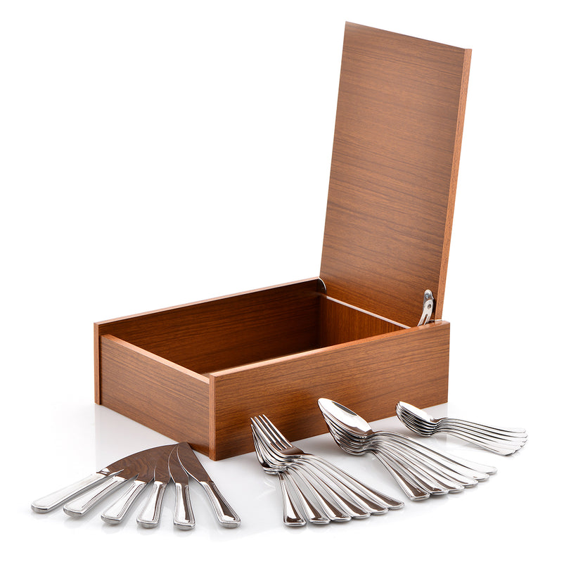 Set tacâmuri 24 piese Perla. Ideal pentru servirea mesei, setul Perla vă oferă 24 de piese din inox, rezistente și elegante. Acestea sunt ușor de depozitat, având o cutie din lemn special compartimentată.