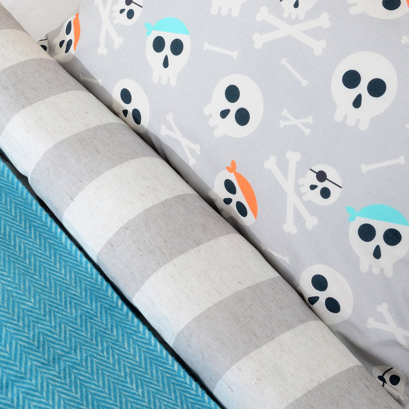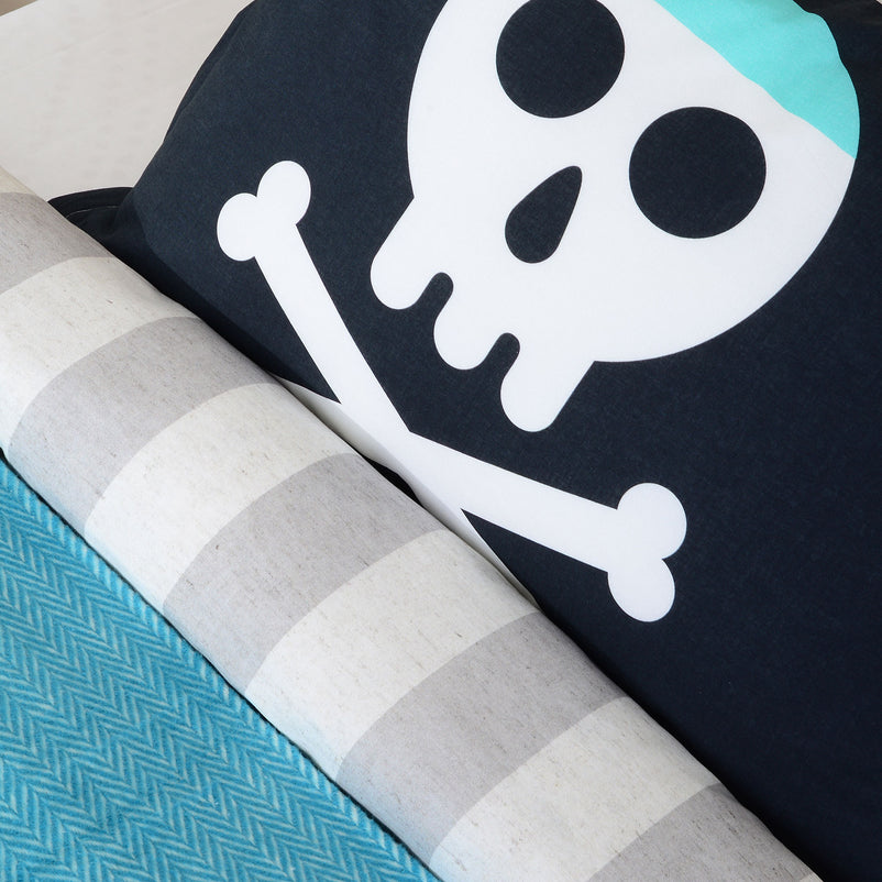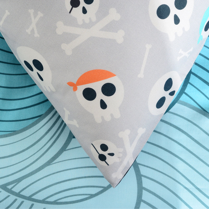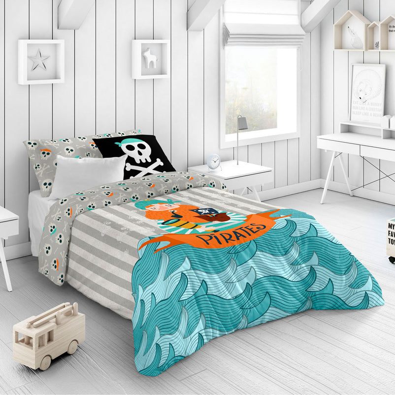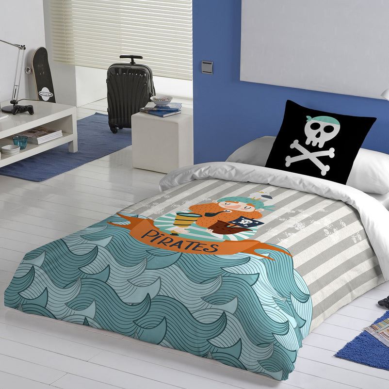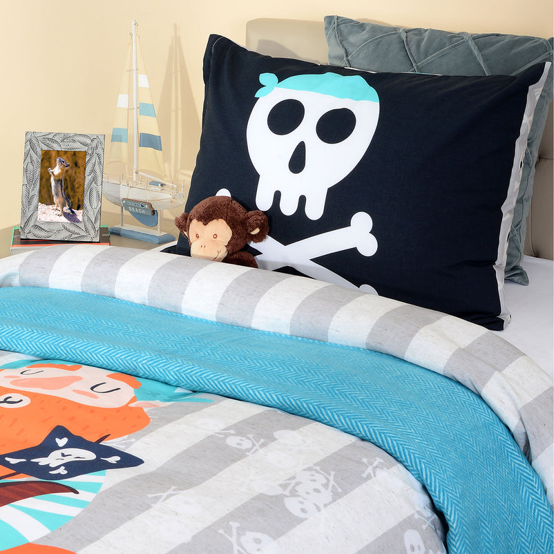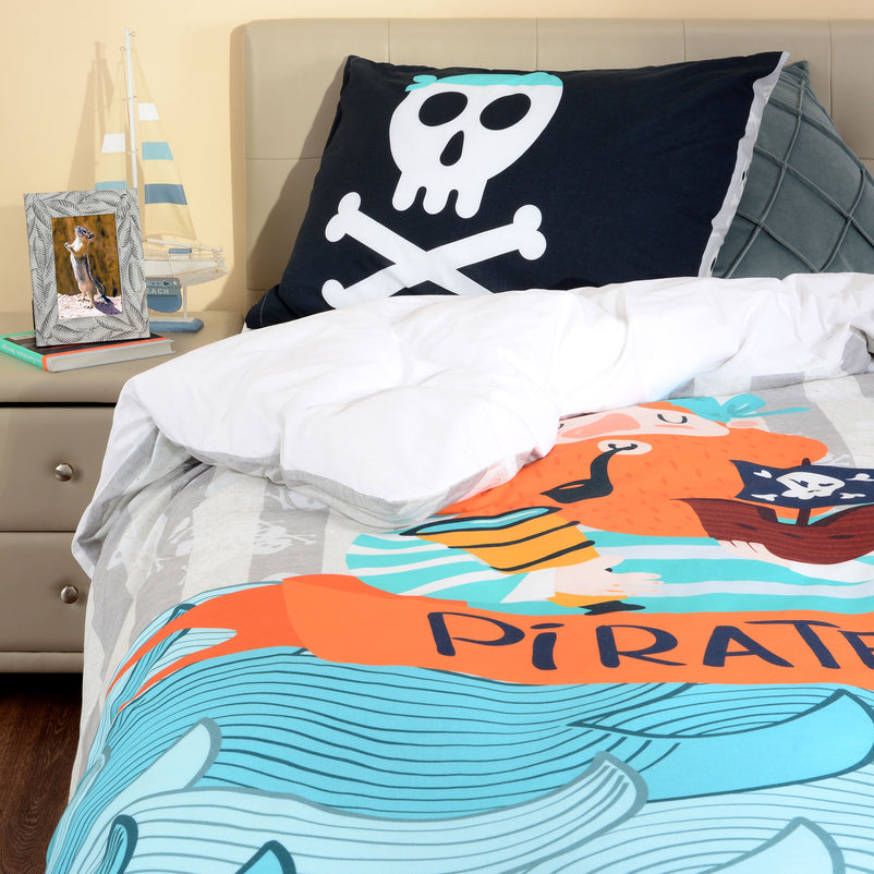 Set așternut 3 piese Pirates. Dormitorul micuților trebuie să fie cât mai plin de viață, iar setul de așternut Pirates se remarcă prin imprimeul colorat, cu personaje jucăușe. Este realizat integral din bumbac, asigurându-i copilului confortul necesar unui somn odihnitor.