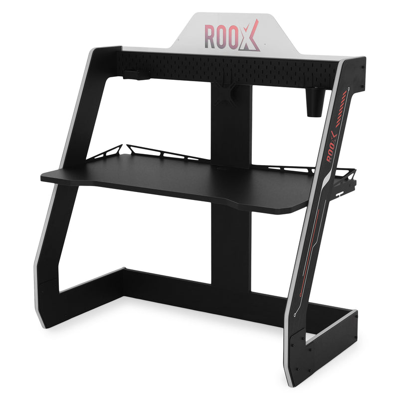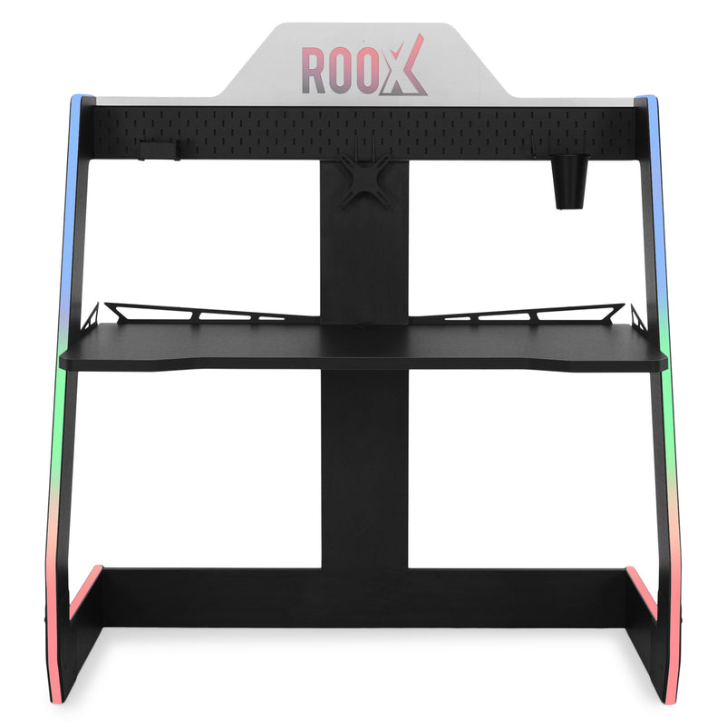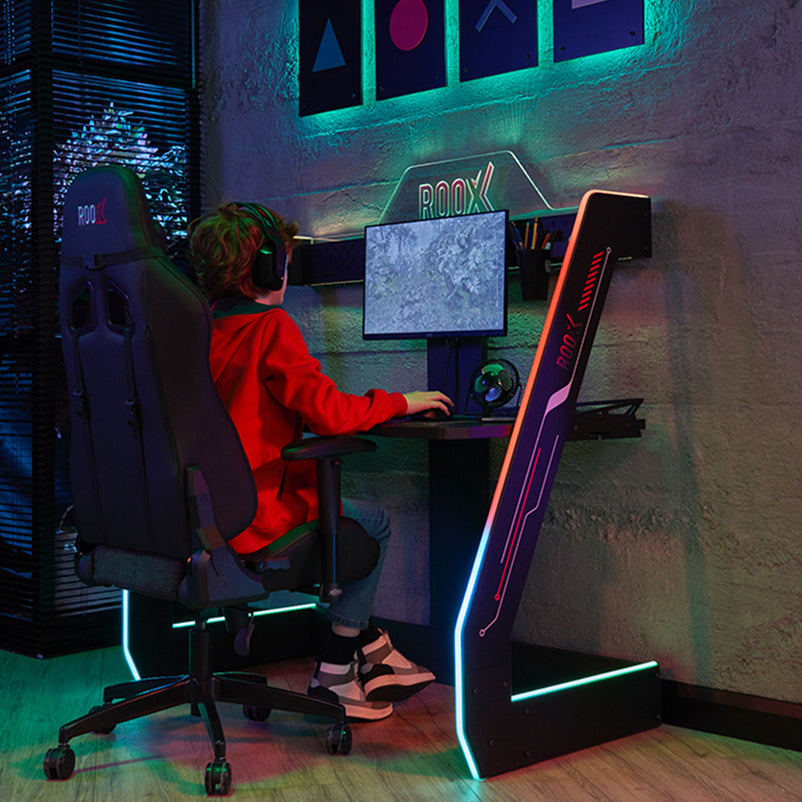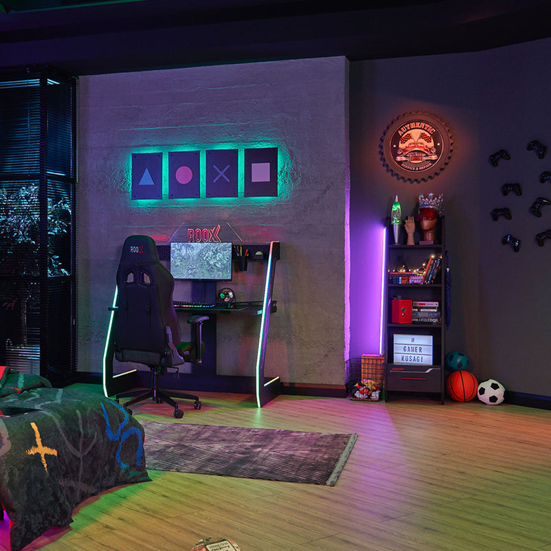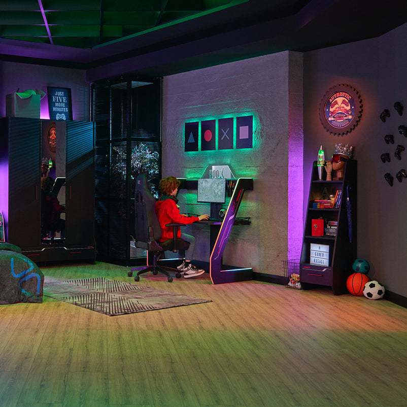 Birou copii, LED-uri și suport monitor Be Cool. Blatul are formă ergonomică iar suprastructura include un panou metalic de care sunt atașate accesorii: suport monitor, suport căști. Pe lateralele biroului se montează led-uri cu lumină RGB reglabilă prin intermediul aplicației IOS sau Android. Prin sunet se activează lumina led-urilor, biroul fiind dotat cu microfon. Un refugiu magic pentru copilul tău, această cameră ce oferă multe module funcționale și culori uimitoare, este destinată băieților dinamici, plini de energie. Be Cool este o cameră care stimulează imaginația și gândirea neconvențională a copiilor, îi motivează atât să învețe cât și să se joace. Mobilierul este realizat din PAL melaminat finisat cu cant rezistent ABS, având o structură stabilă și design imprimat UV. Mânerele din plastic de culoare roșie electrizantă și luminile tip LED cu lumină reglabilă RGB de pe conturul patului și biroului, subliniază personalitatea dinamică a copilului. Cele 5 module disponibile acoperă toate funcțiunile necesare într-o cameră de copil: zona de studiu, reprezentată prin etajeră și biroul cu panou supraînălțat, zona de depozitare și somn reprezentată prin dulapul cu 3 uși, patul 120 și noptiera. Benzile cu LED-uri sunt inserate la tablia patului și pe conturul biroului, fiind incluse în preț. Atractivă și funcțională, camera Be Cool acomodează un copil energetic și cu stima de sine ridicată, performant atât la lecții cât și la jocurile PC.